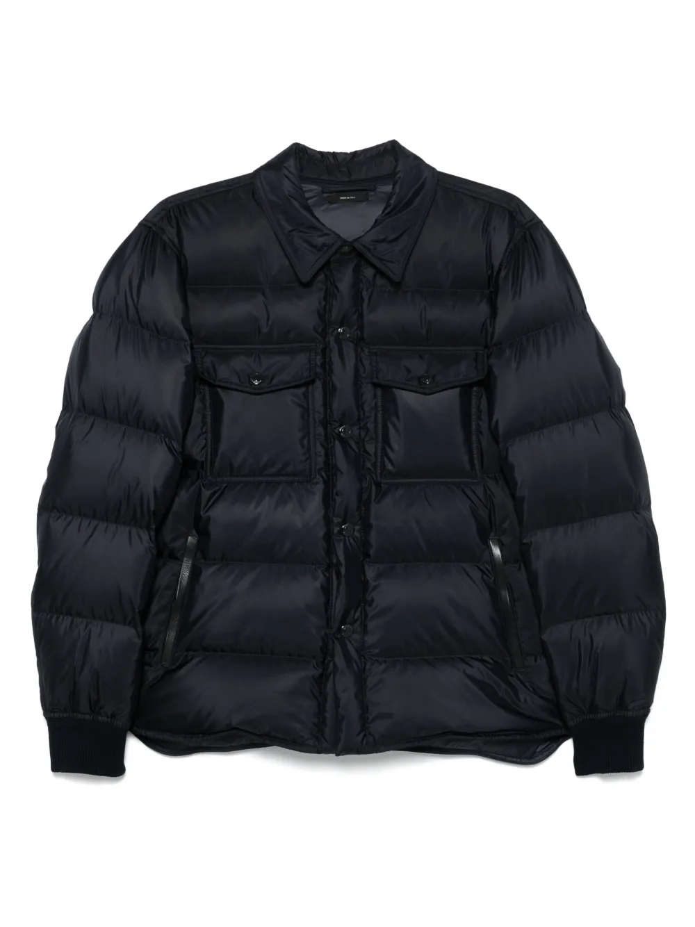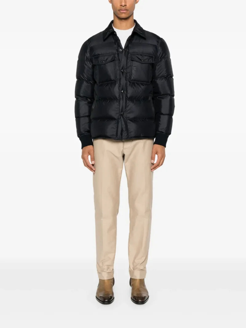 Jacheta TOM FORD Padded bleumarin, model matlasat integral cu guler clasic, inchidere cu capse, maneci lungi, mansete elastice, buzunare multiple si captusita cu pene de gasca. Potrivita pentru sezonul toamna/iarna. 100% poliester; 100% poliamida; 90% fulgi de gasca; 10% pene de gasca.