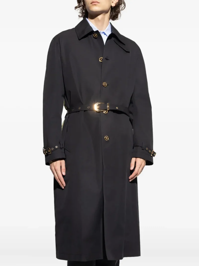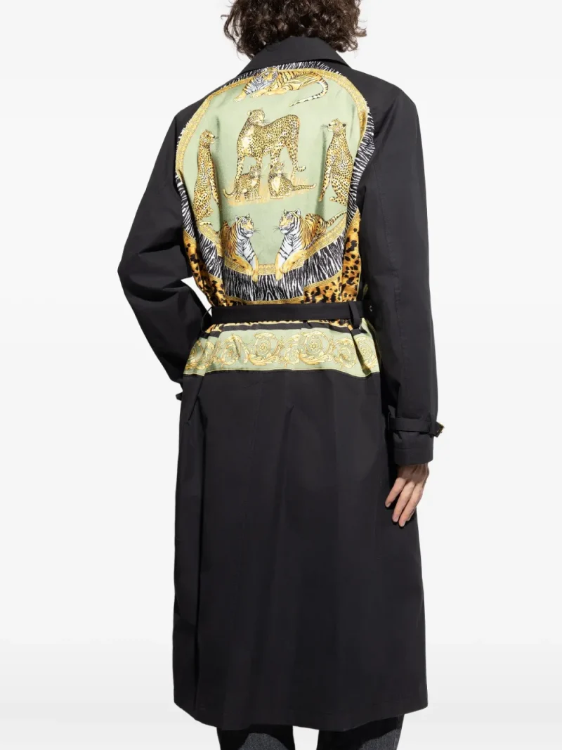 Jacheta Versace belted animal-print negru, talie cu curea, inchidere catarama, imprimeu animal print pe partea din spate, detaliu mansete, guler inalt.100% bumbac