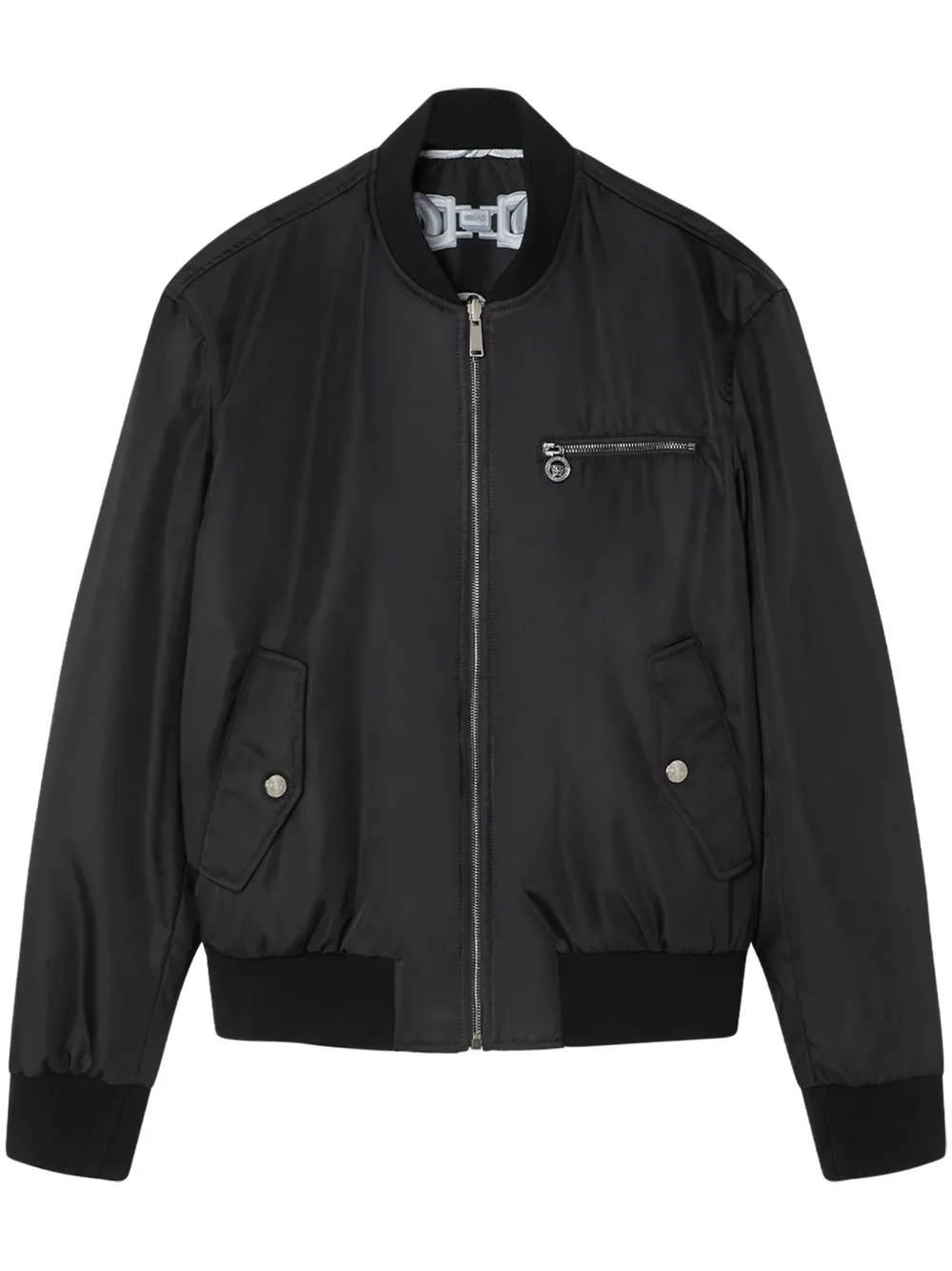 Jacheta Versace Chain Link-Print Bomber negru, reversibila, din poliester, cu guler tip baseball, inchidere cu fermoar, maneci lungi, mansete elastice, buzunar cu fermoar la piept, buzunare tip welt si tiv elastic drept. Potrivita pentru sezonul primavara/vara. 100% textil.