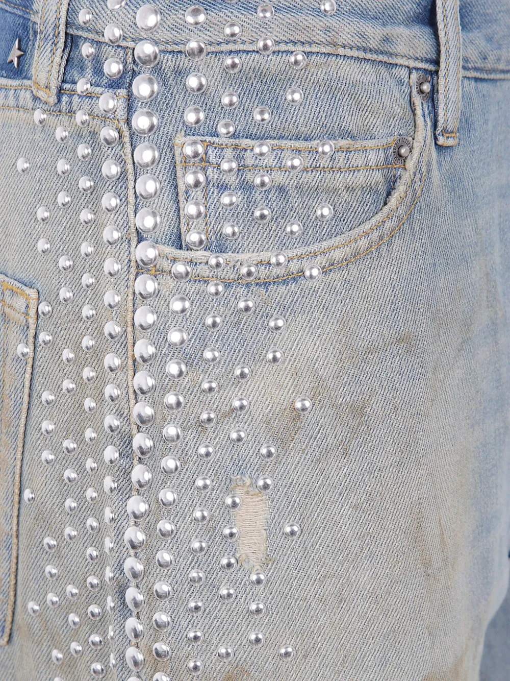 Jeans Golden Goose side-stud albastru, inchidere fermoar si nasture, talie inalta, aspect uzat, detaliu stea la spate.100% bumbac