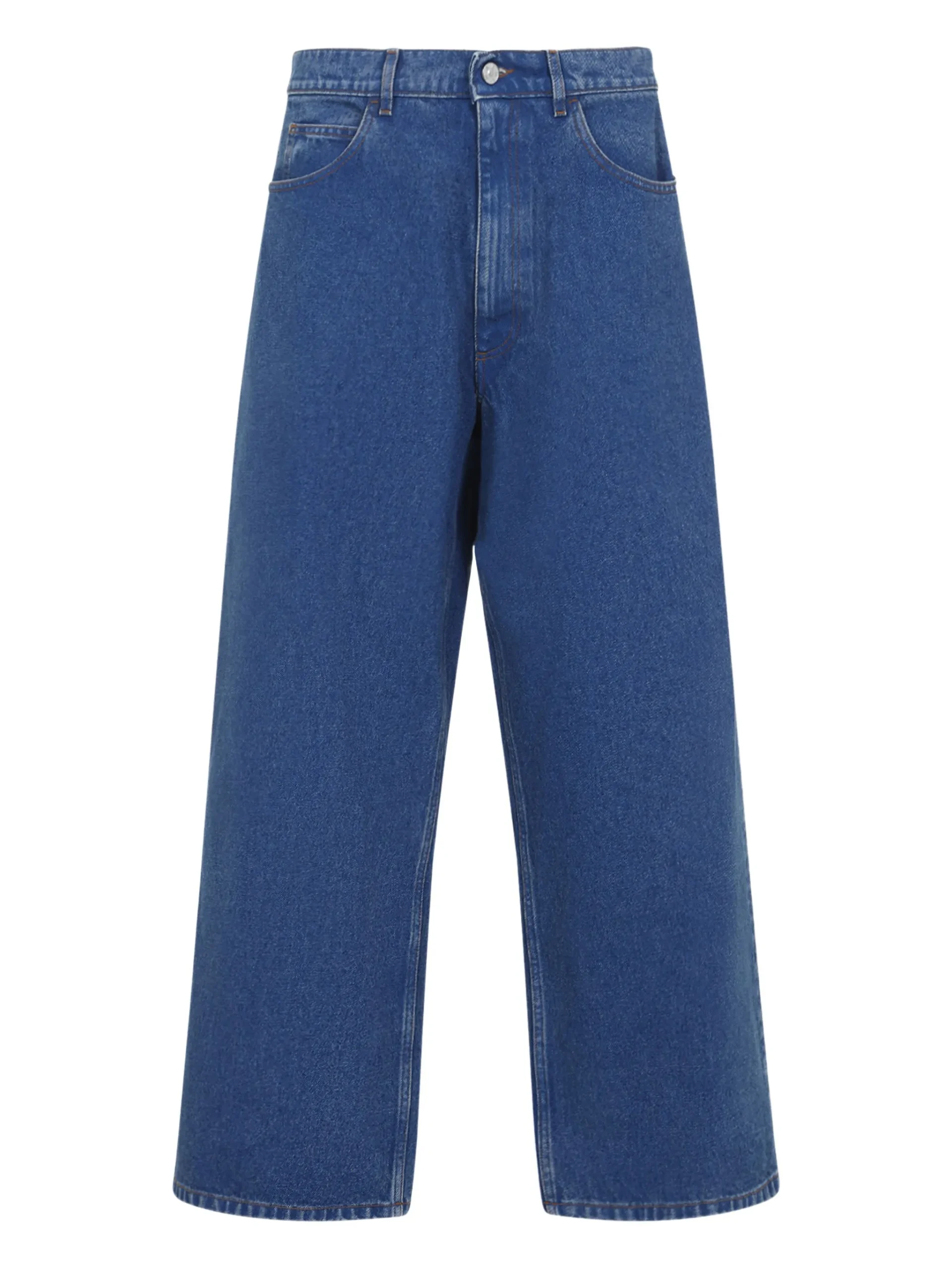 Jeans Marni logo-patch albastru, inchidere cu fermoar si nasture, model clasic cu 5 buzunare, logo imprimat pe spate. 100% bumbac