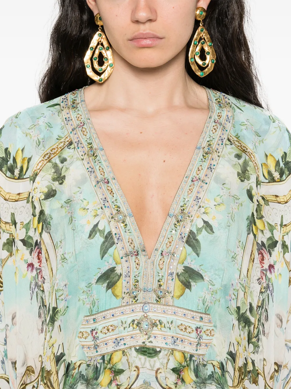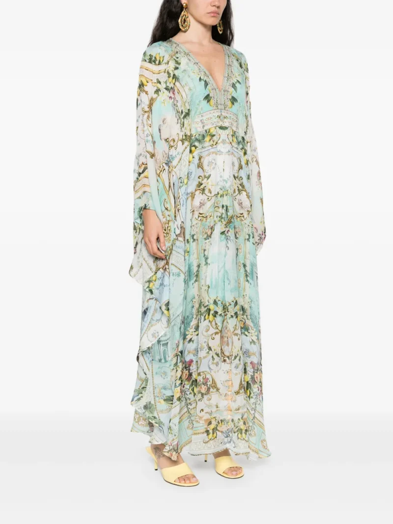 Kaftan maxi Camilla Graphic-Print Silk albastru, din matase, cu guler inalt si inchidere snur, maneci medii largi, grafica Camilla in tesatura si tiv drept. Potrivita pentru sezonul primavara/vara. 100% matase.