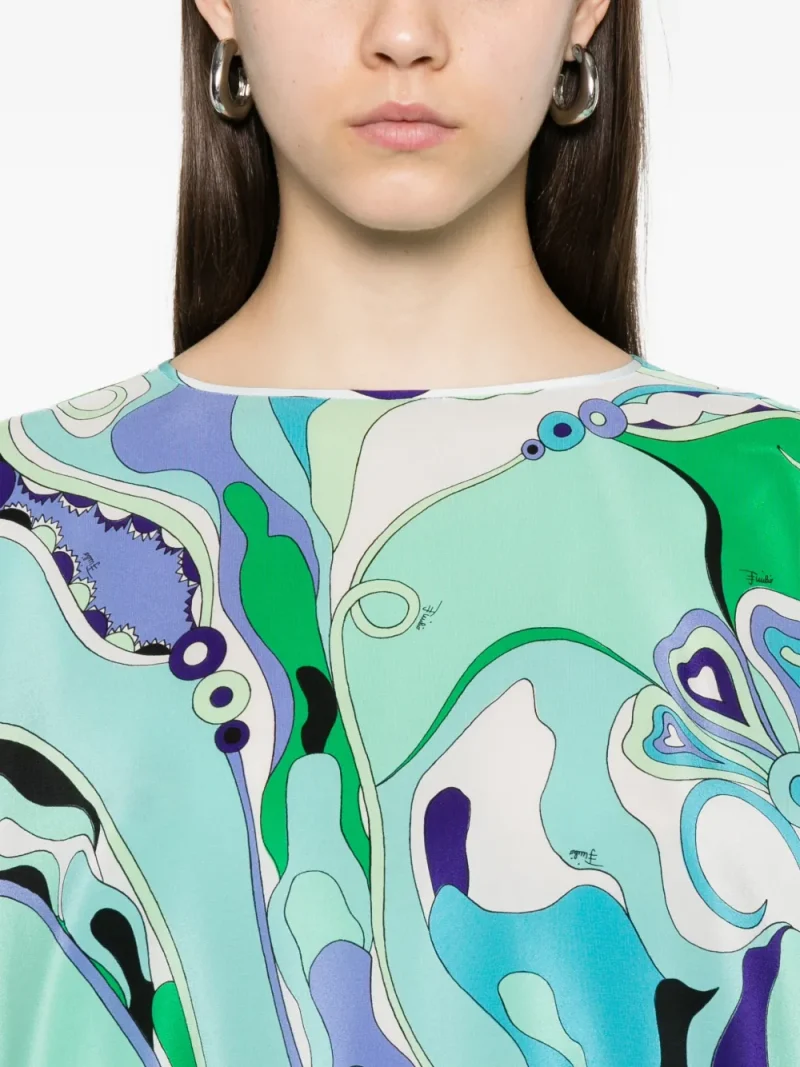 Kaftan PUCCI Orchidee-Print Silk verde, din matase naturala, cu guler rotund, croiala fluida, grafica PUCCI „Orchidee-Print” imprimata si tiv drept. Potrivit pentru sezonul toamna/iarna. 100% matase.