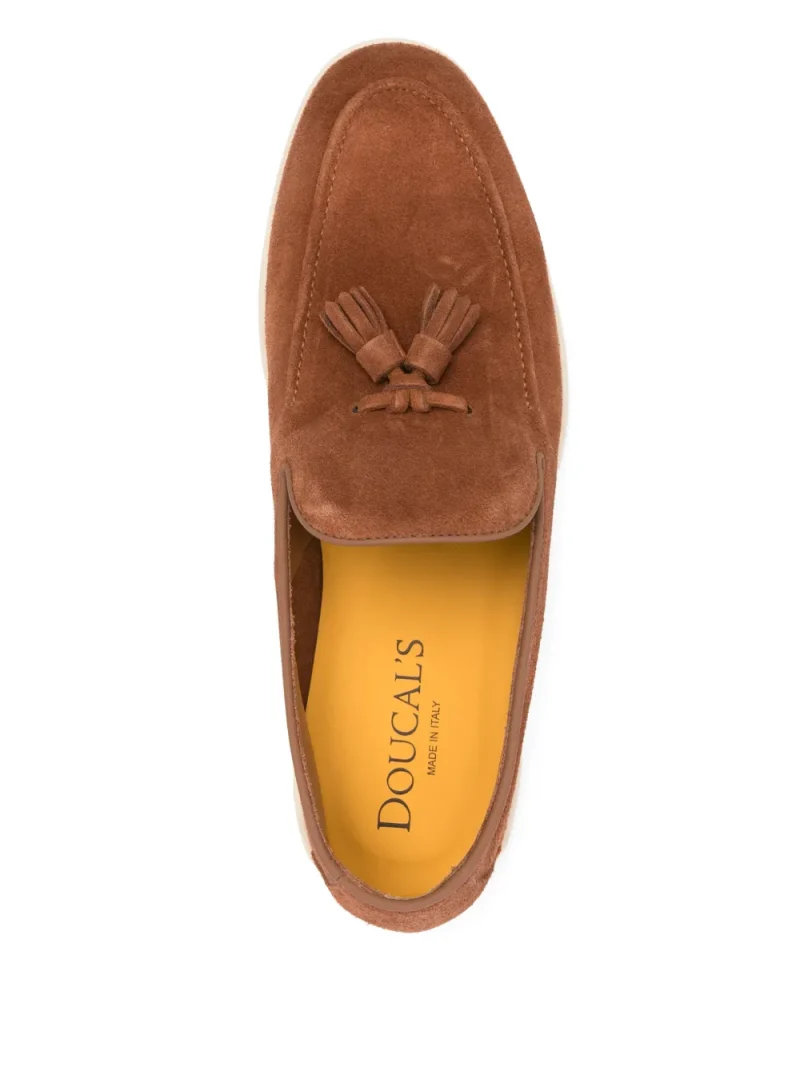 Loafers Doucal’s Suede maro, din piele, cu profil jos, slip-on style, cu bareta decorativa, logo imprimat pe talpa si bot rotunjit. 100% piele de vitel; 100% cauciuc; 100% piele intoarsa.