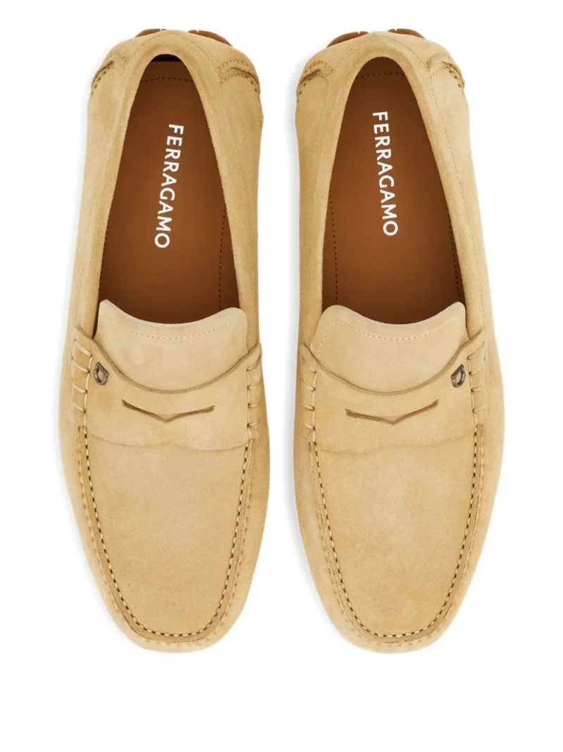 Loafers Ferragamo Gancini-Plaque ecru, din piele intoarsa, cu profil jos, slip-on, talpa cu logo imprimat, cusaturi in relief si bot rotunjit. 100% piele intoarsa de vitel; 100% cauciuc; 100% piele de vitel.