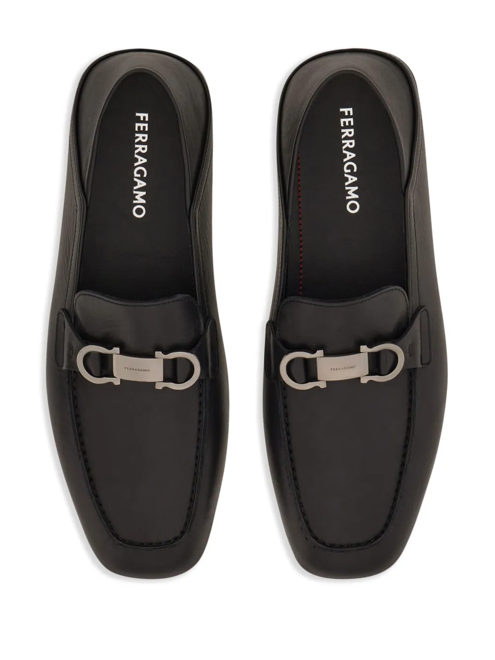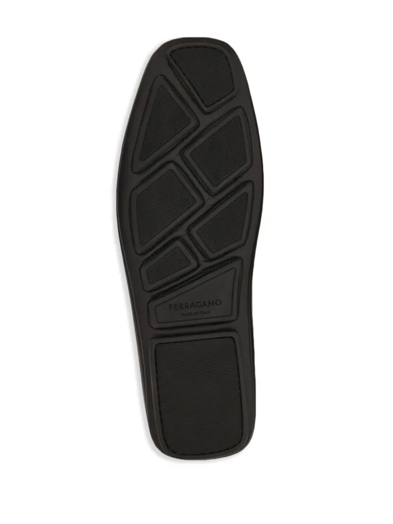 Loafers Ferragamo Gancini-Plaque negru, din piele naturala, cu profil jos, bareta cu logo metalic Ferragamo Gancini aplicata, cusaturi in relief, captuseala din piele, bot patrat si talpa din cauciuc. 100% piele de vitel; 100% piele de vitel.