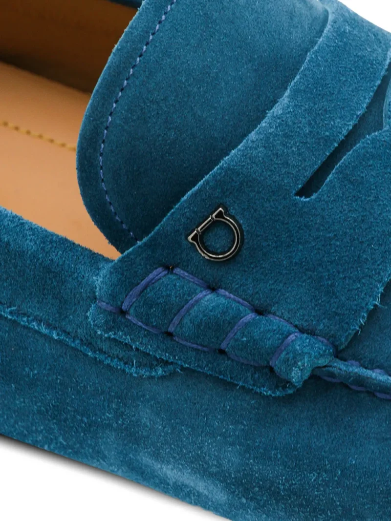 Loafers Ferragamo Metal Trim albastru, din piele intoarsa, cu profil jos, slip-on, talpa cu logo imprimat, cusaturi in relief si bot rotunjit. 100% piele intoarsa de vitel; 100% cauciuc; 100% piele de vitel.