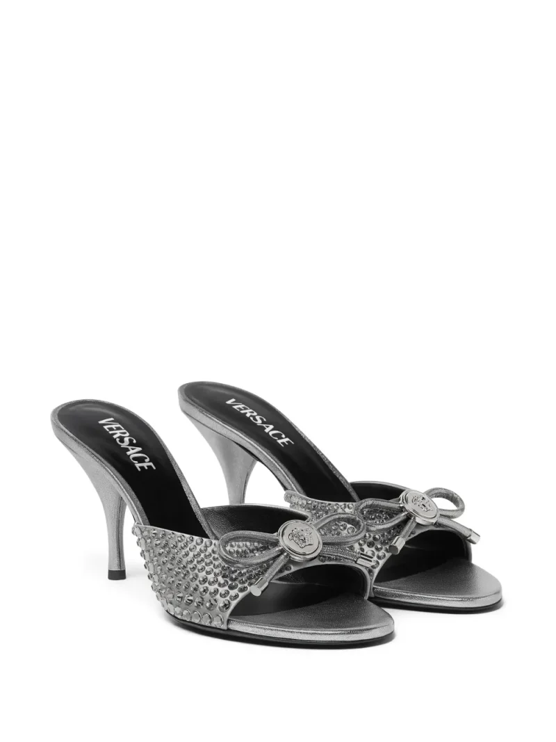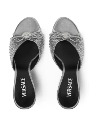 Mules Versace 85 mm argintiu, slip-on style, fara inchidere, bareta decorata cu Medusa Bow si cristale sclipitoare, talpa inclinata si logo imprimat. Piele de miel 100%; Piele de vitel; 100% Piele de vitel 100%