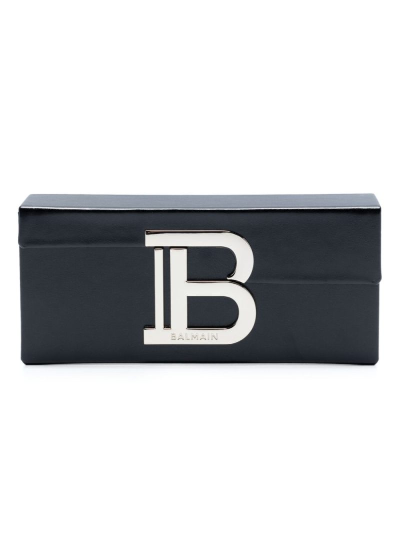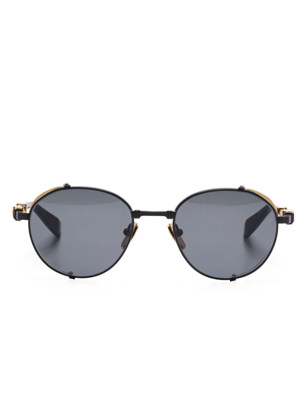Ochelari Balmain Eyewear Brigade I negru, din acetat, alama, plexiglass, acetat si titanium, cu brate curbate, decoratiuni aurii si logo gravat pe lentila. 100% plexiglass; 100% alama; 100% acetat; 100% titanium. Acesti ochelari de soare vin insotiti de toc.
