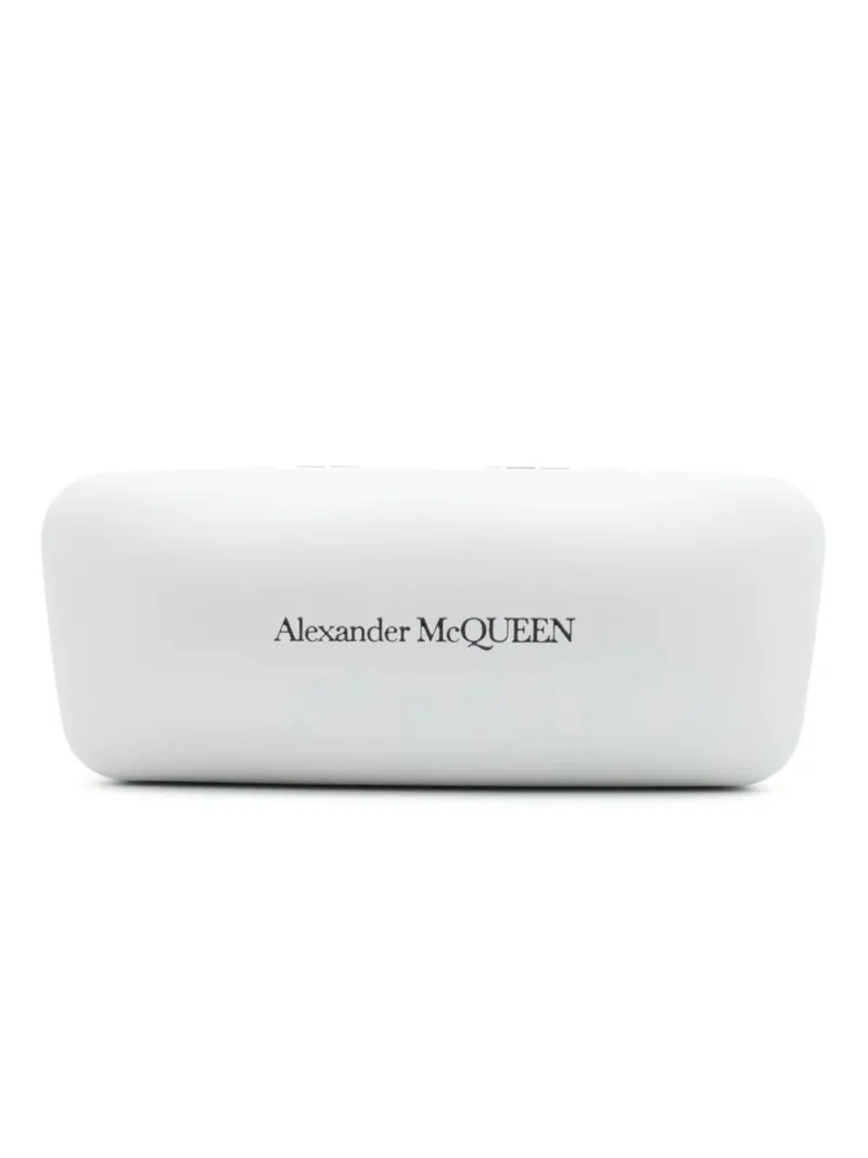 Ochelari de soare negri din acetat, cu forma ramei dreptunghiulara, logo Alexander McQueen gravat pe laterale, suport din silicon pentru nas, brate drepte si varfuri curbate. 100% acetat. Acesti ochelari de soare vin insotiti de toc.