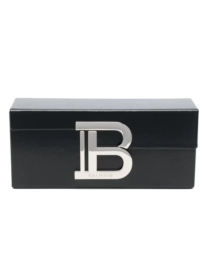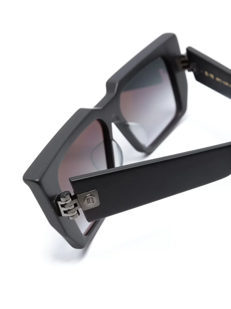 Ochelari de soare negri din acetat, cu forma ramei cat eye, lentile gradient gri inchis, brate oversized cu logo metalic Balmain si varfuri curbate. 100% acetat. Acesti ochelari de soare vin insotiti de toc.