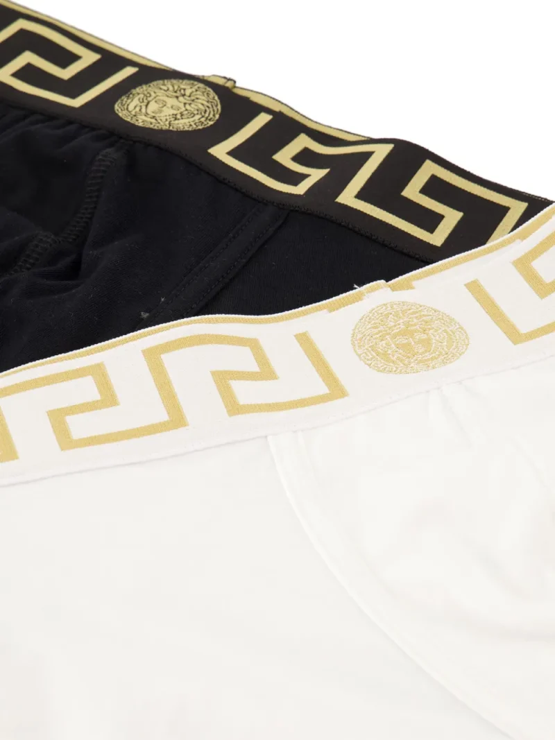 oxeri Versace Greca Border (2 set) alb/negru, din bumbac, cu talie elastica si logo Greca in tesatura. 100% bumbac. Aveti grija sa probati lenjeria intima deasupra propriilor articole de imbracaminte.