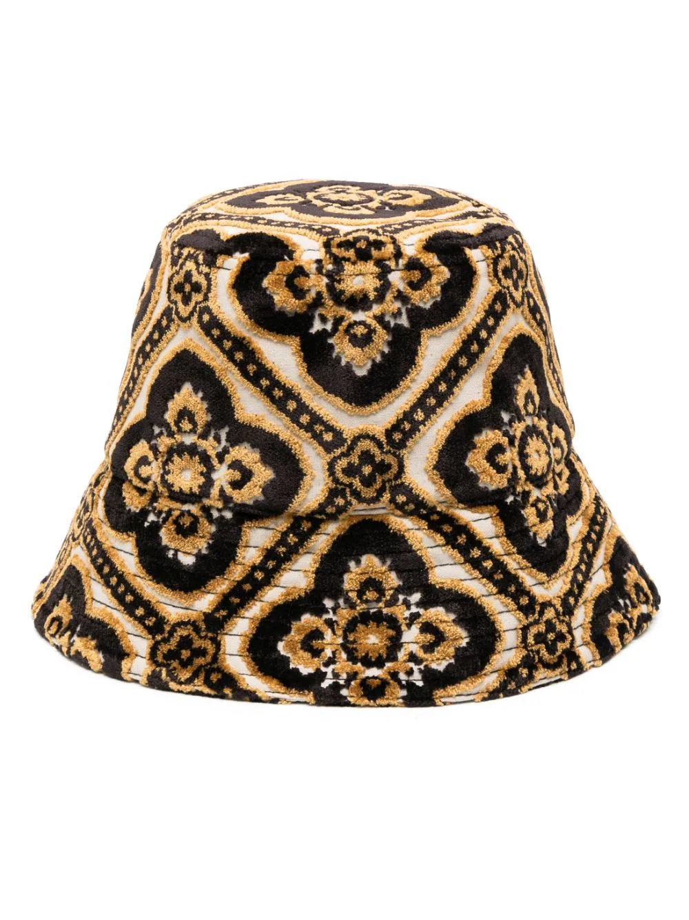 Palarie multicolor din catifea jacquard, tip bucket hat, fara inchidere, cu imprimeu in tesatura pe toata suprafata si cozoroc lat. 53% viscoza; 47% bumbac; 52% viscoza; 48 acetat.