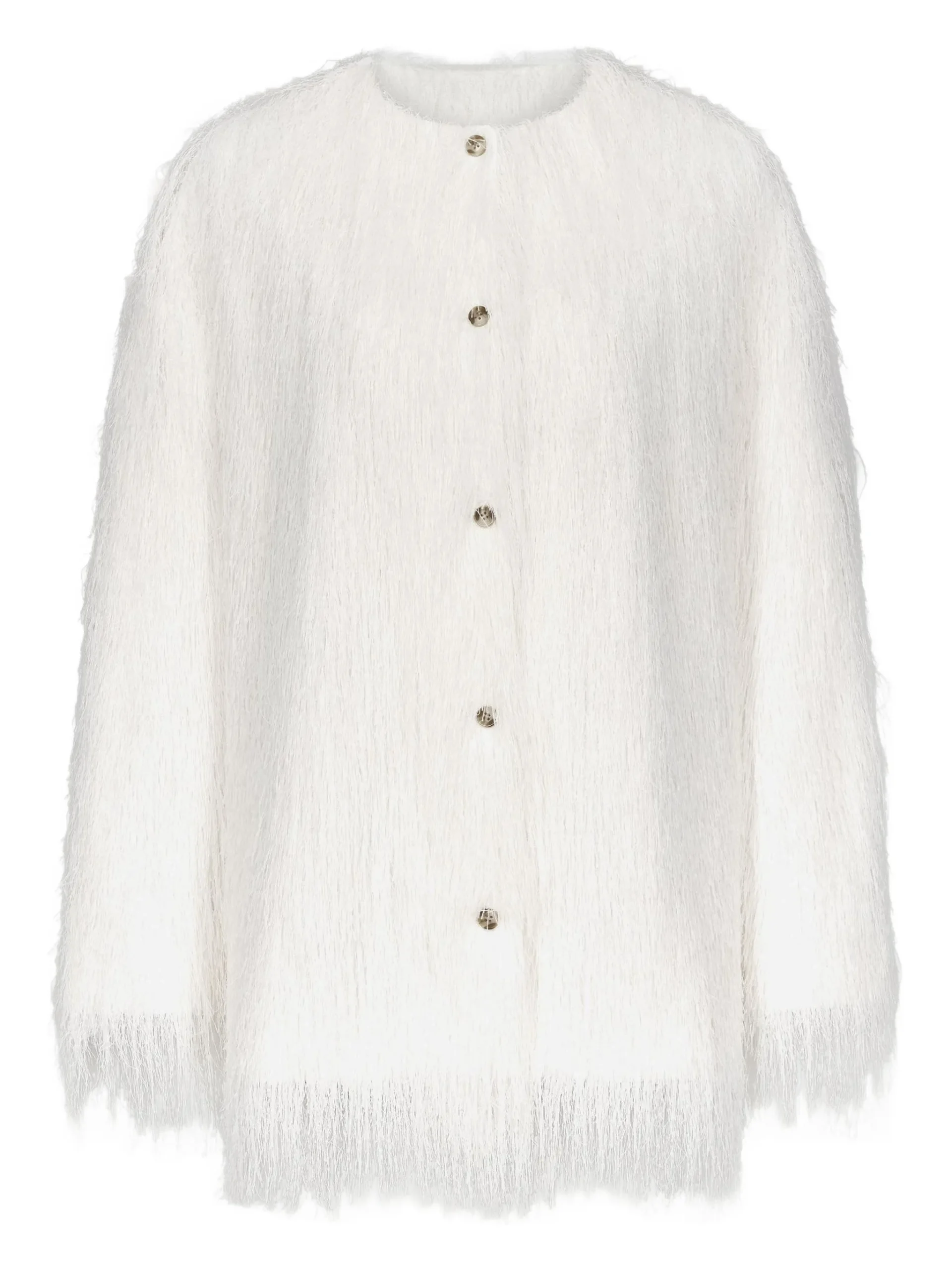 Palton LouLou De Saison Filipo alb, din material cu franjuri, cu inchidere cu cinci nasturi, decolteu fara guler si linii rotunjite.100% poliester