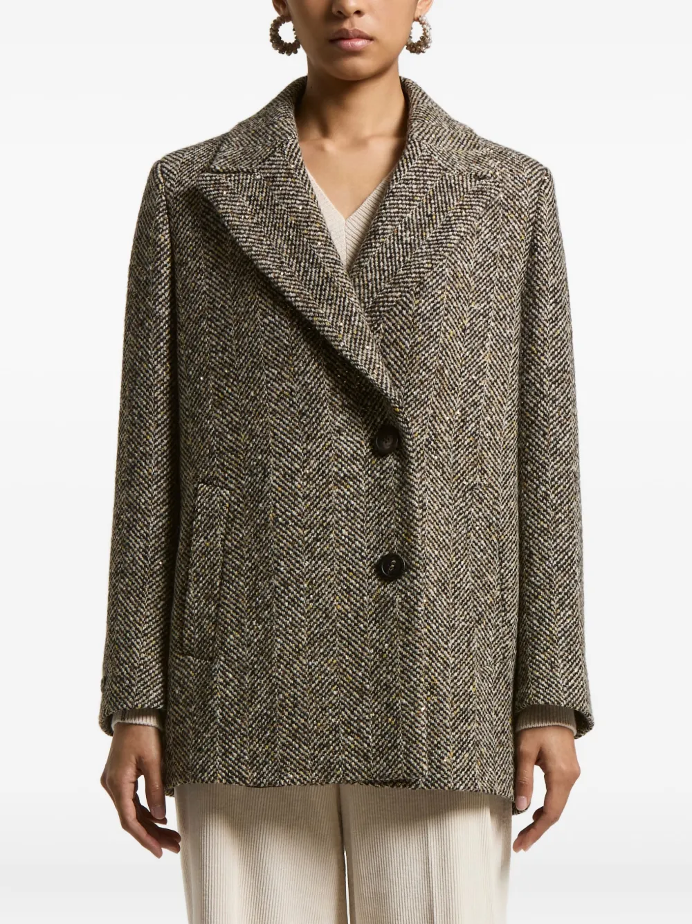 Palton Peserico Herringbone Tweed maro, construit din lana, cu rever crestat, inchidere cu nasturi, maneci lungi, buzunare laterale, tesatura herringbone si tiv drept. Potrivit pentru sezonul toamna/iarna.80% lana; 11% nylon; 9% poliester.