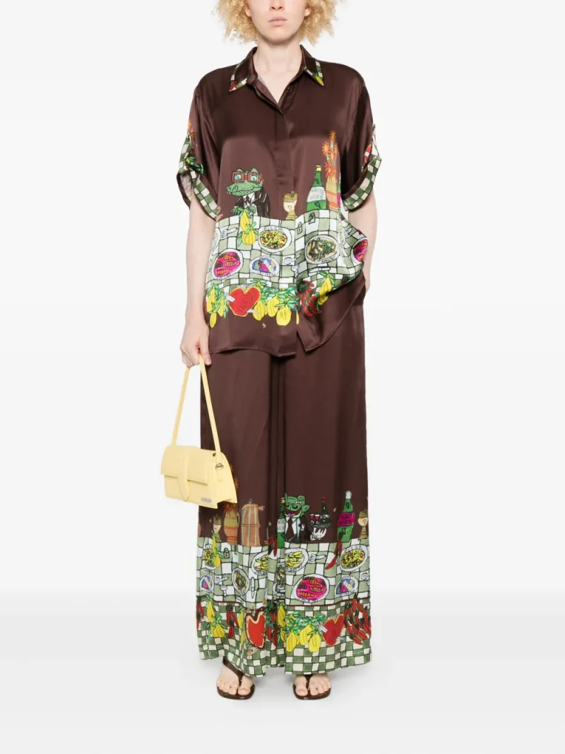 Pantaloni Alemais Drawstring-Waist Printed maro, din matase satinata, wide-fit, cu talie inalta elastica si inchidere snur, grafica abstracta imprimata si tiv drept. Potriviti pentru sezonul toamna/iarna. 100% matase.