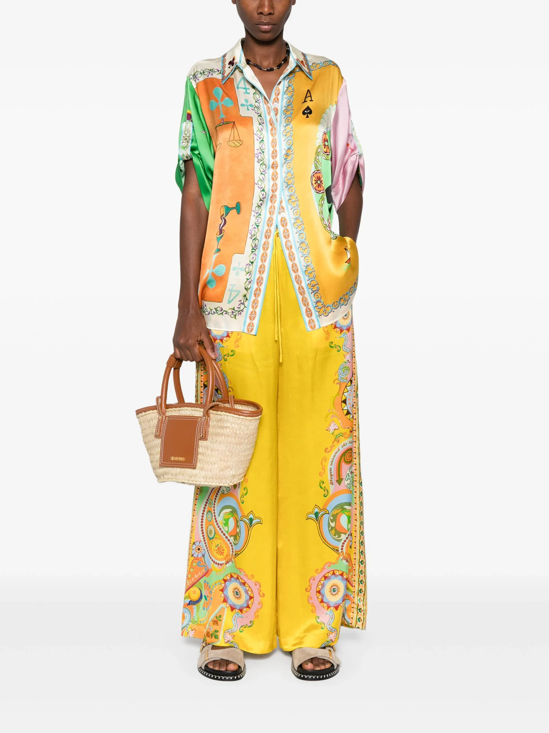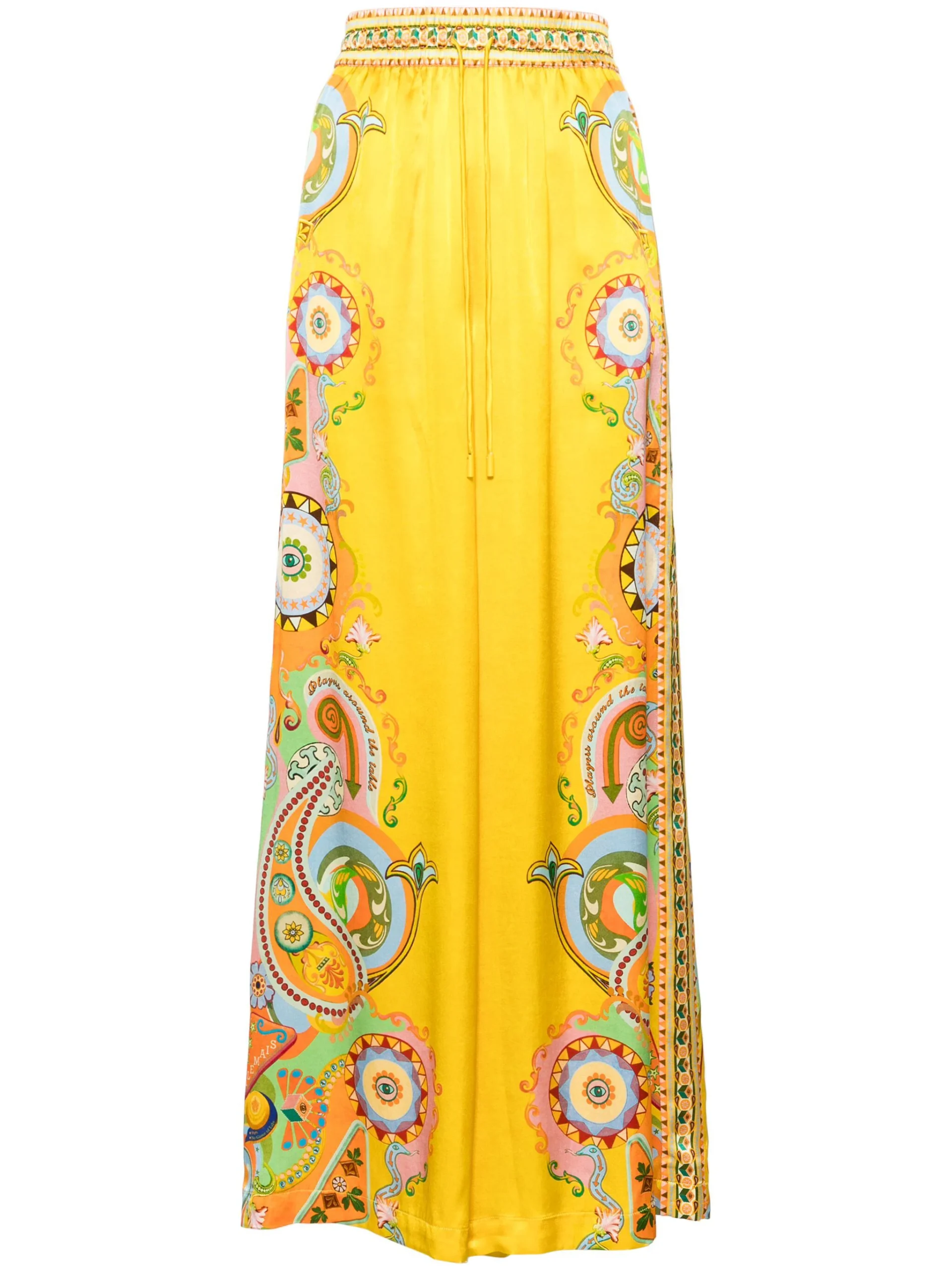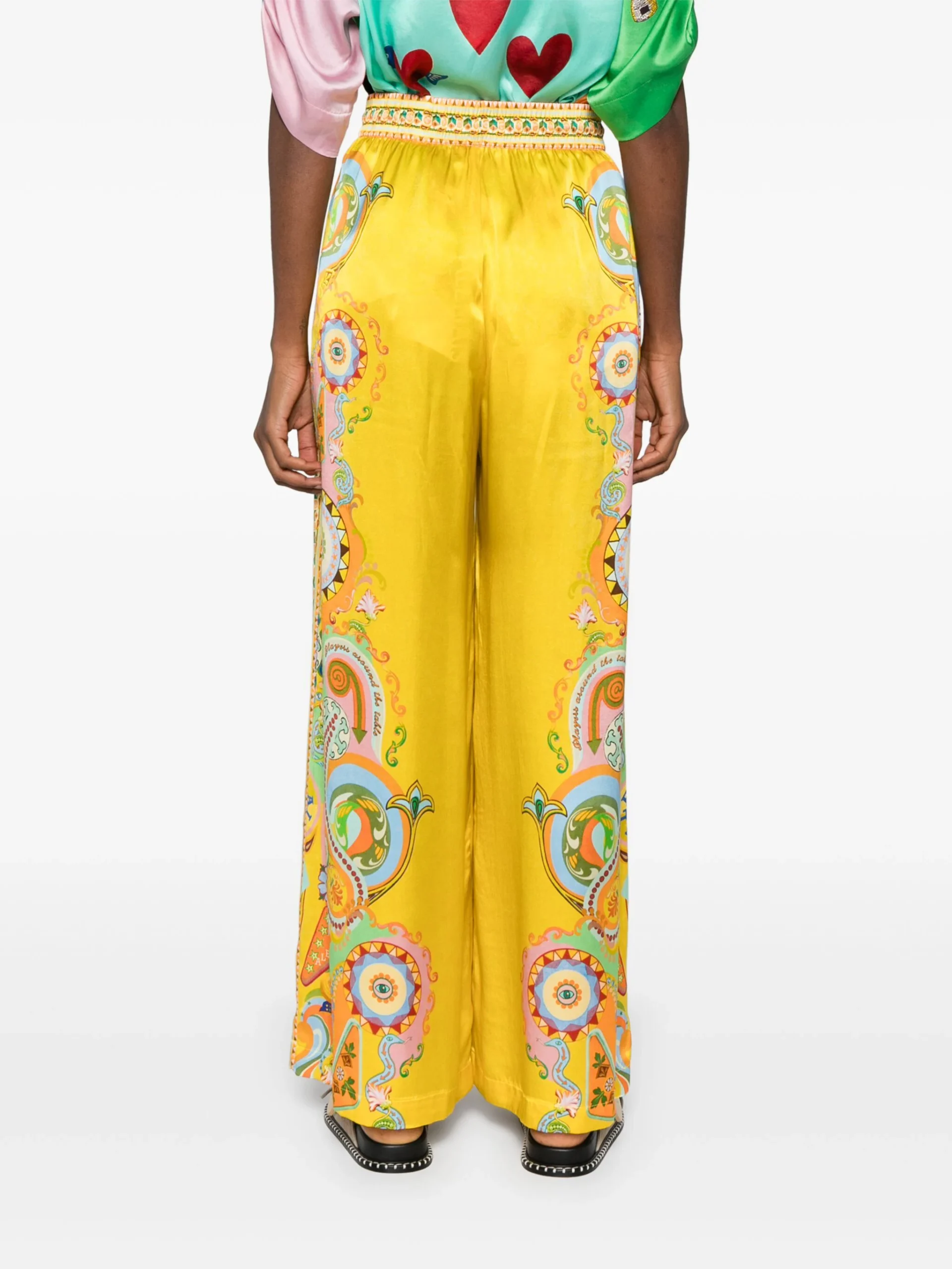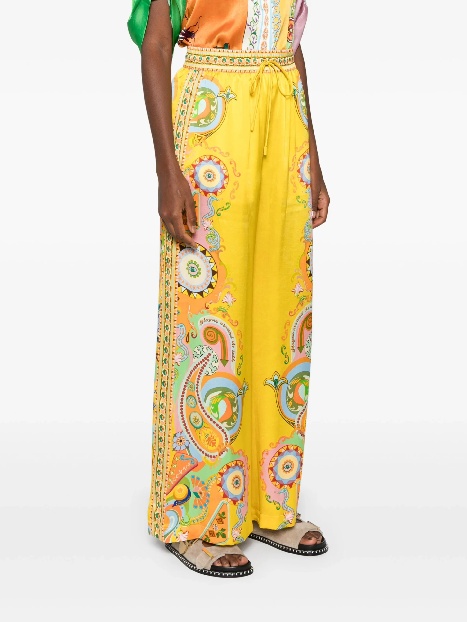 Pantaloni Alemais Pinball multicolor din matase, cu talie inalta, inchidere banda elastica si snur, grafica Alemais Pinball imprimata pe toata suprafata, buzunare laterale si tiv drept. Potriviti pentru sezonul primavara/vara. 100% matase.