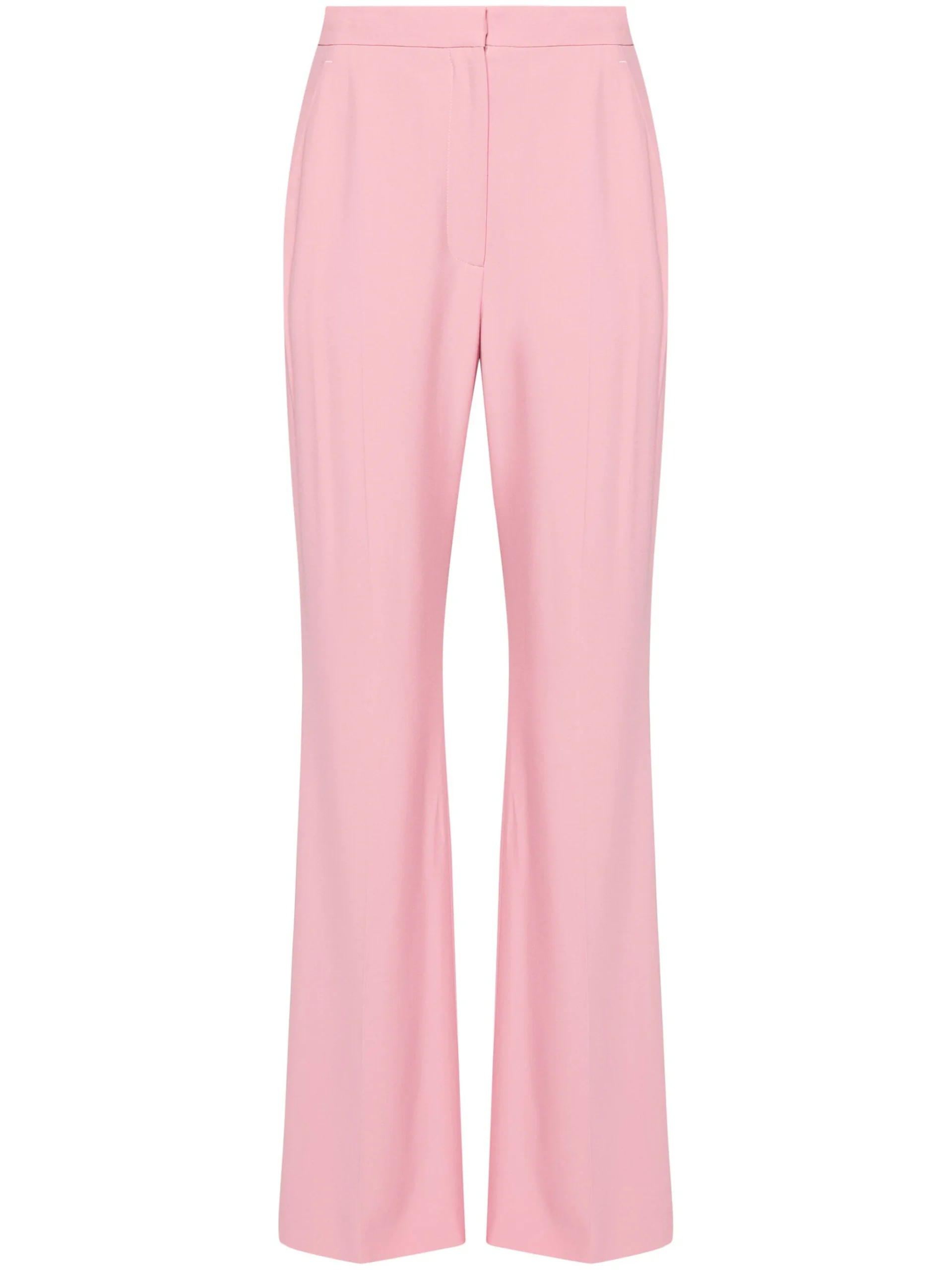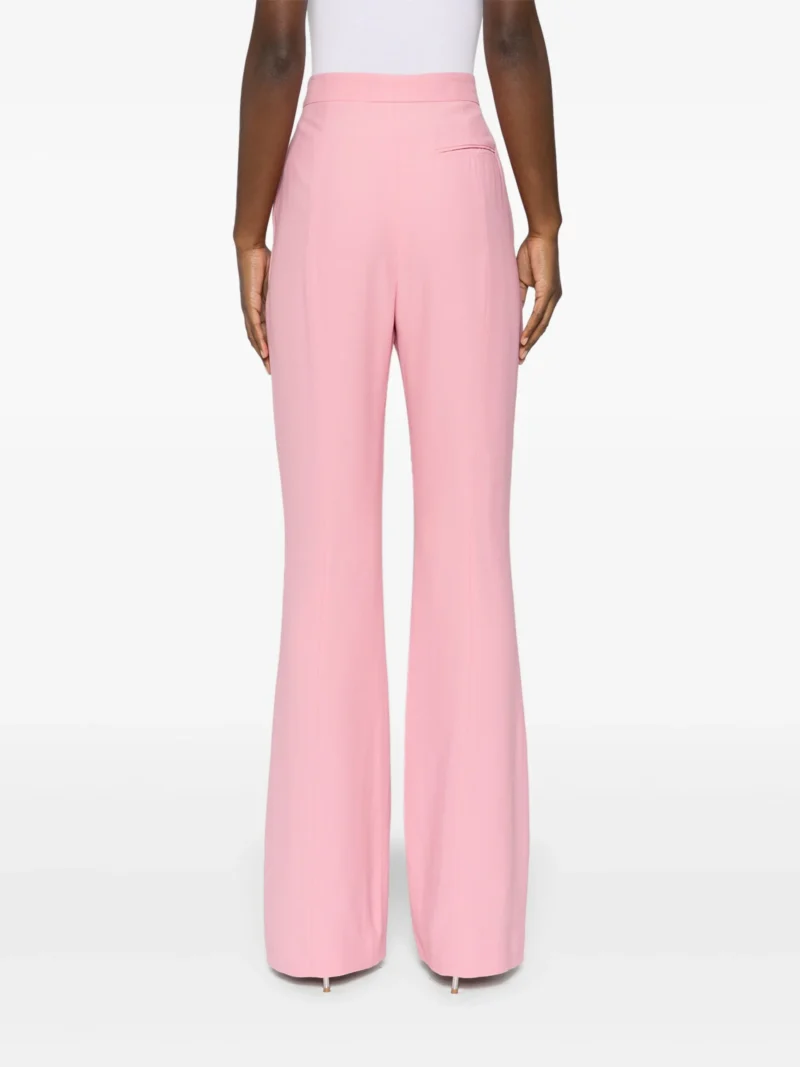 Pantaloni roz din viscoza, cu talie inalta, inchidere clasica, eticheta AMQ cusuta, dunga verticala, buzunare laterale, buzunar la spate si tiv evazat. Potriviti pentru sezonul toamna/iarna. Viscoza 52%, Acetat 48%