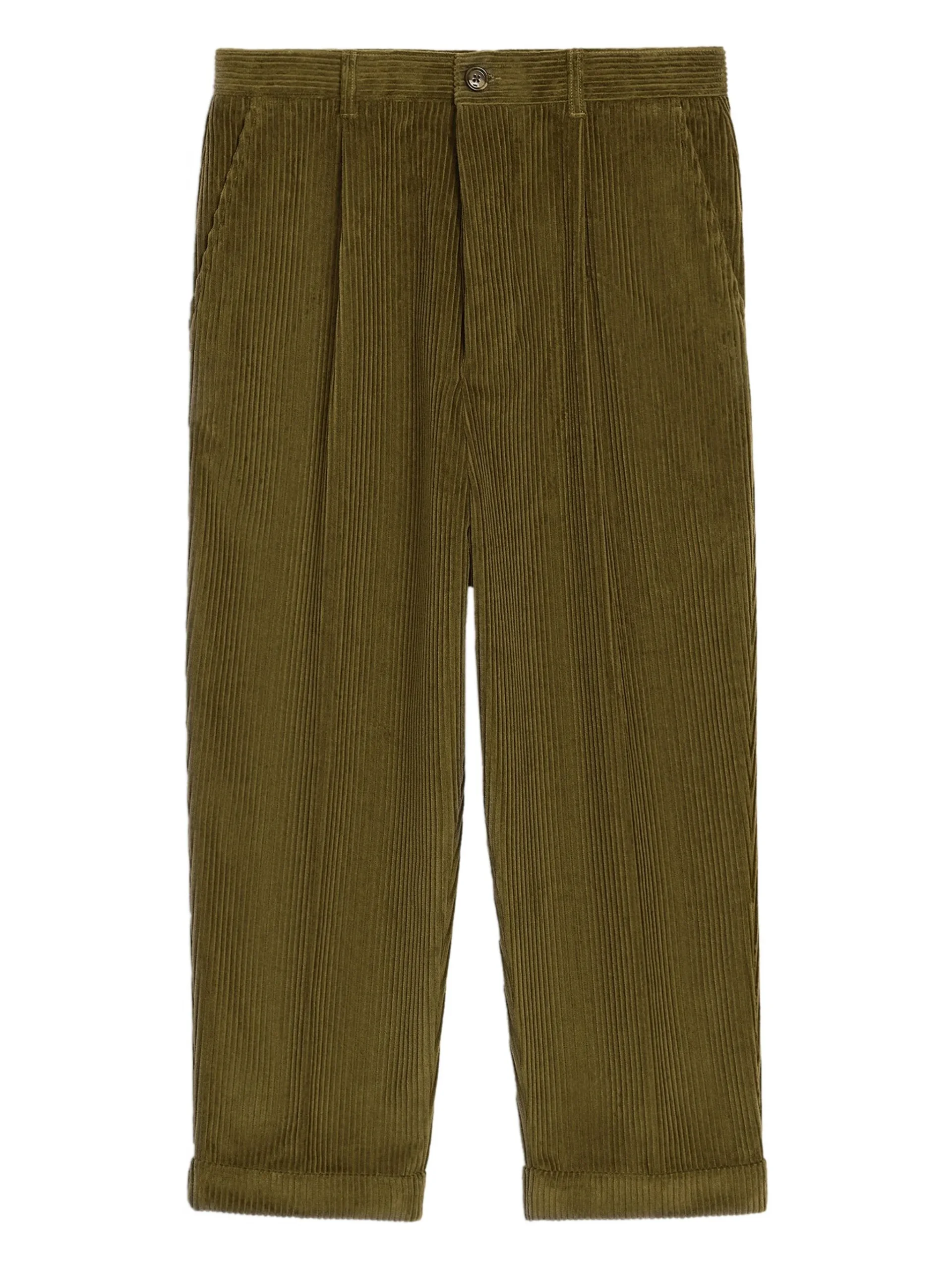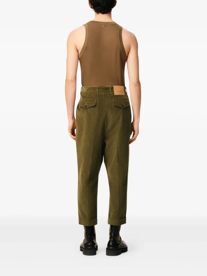 Pantaloni Ami Paris verde masliniu, cu textura din corduroy, tivuri indoite, pliuri frontale si inchidere cu nasturi. Potriviti pentru sezonul toamna/iarna. 100% bumbac.