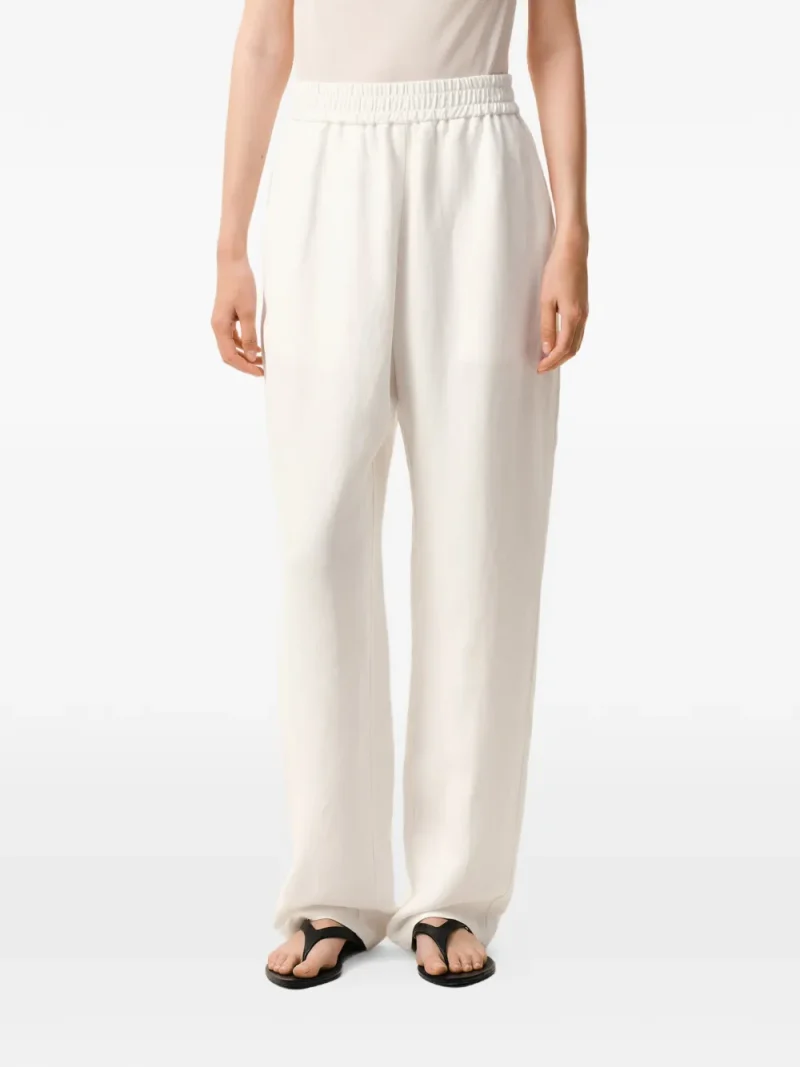 Pantaloni AMI Paris Elasticated Waist alb, realizati din mix de viscoza si in, cu talie elastica, buzunare laterale, buzunare aplicate la spate, logo metalic gravat si tiv drept. Potriviti pentru sezonul primavara/vara. 54% viscoza; 46% in.