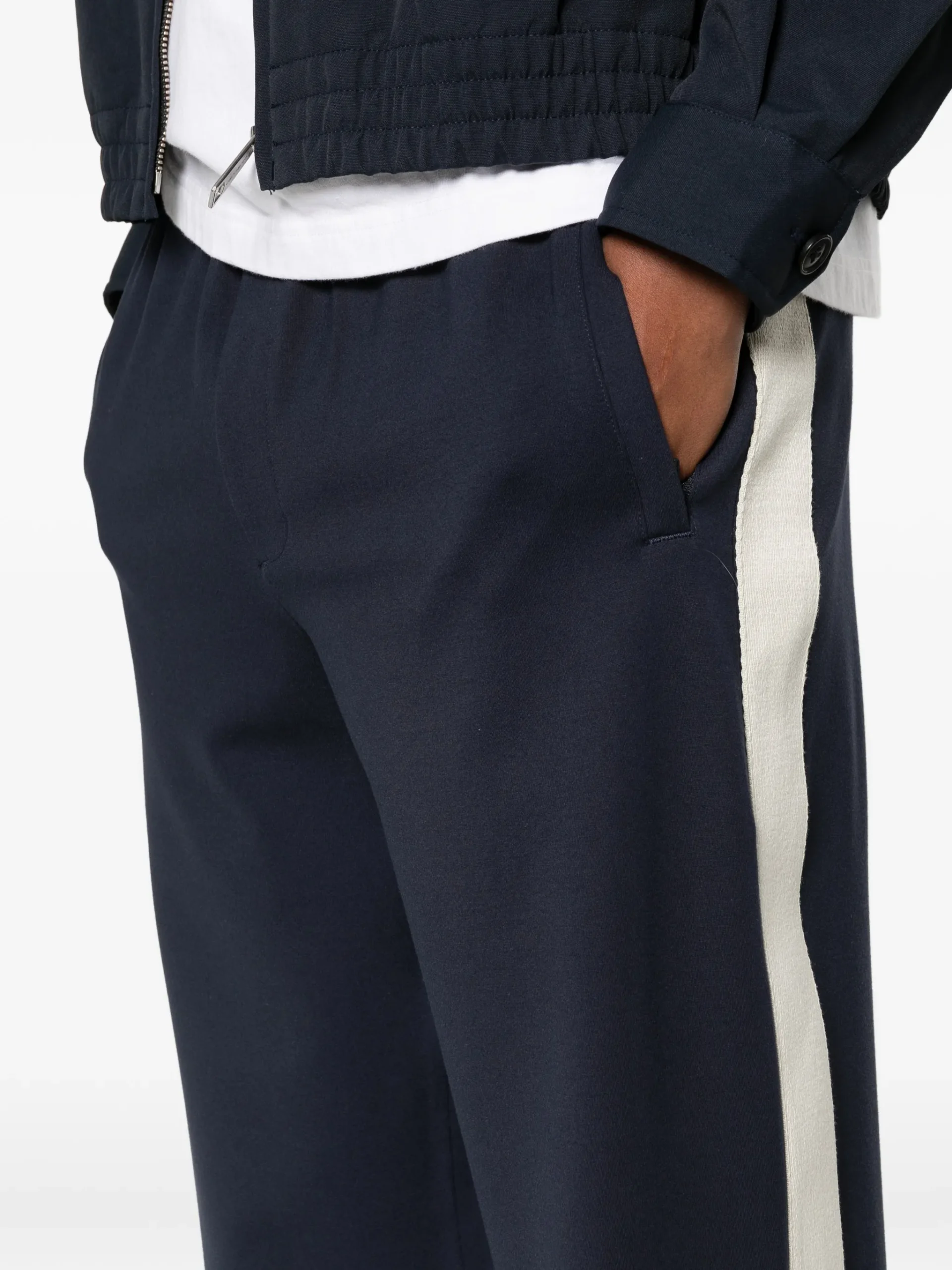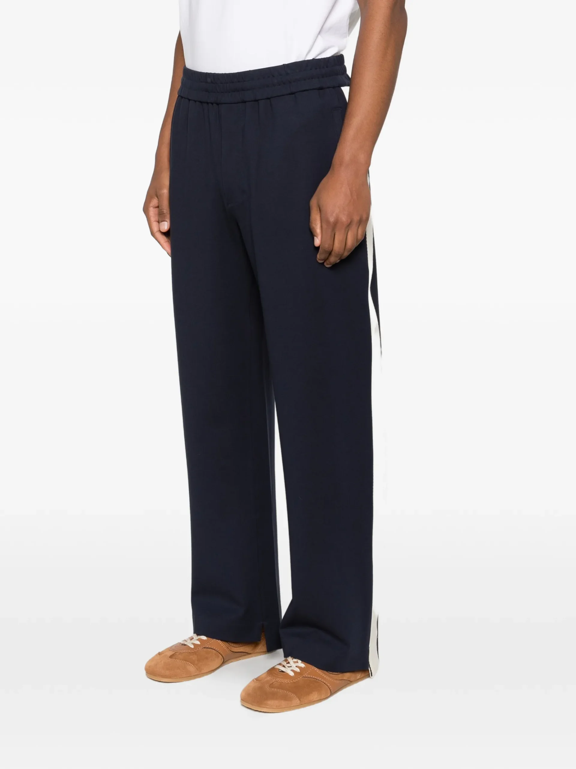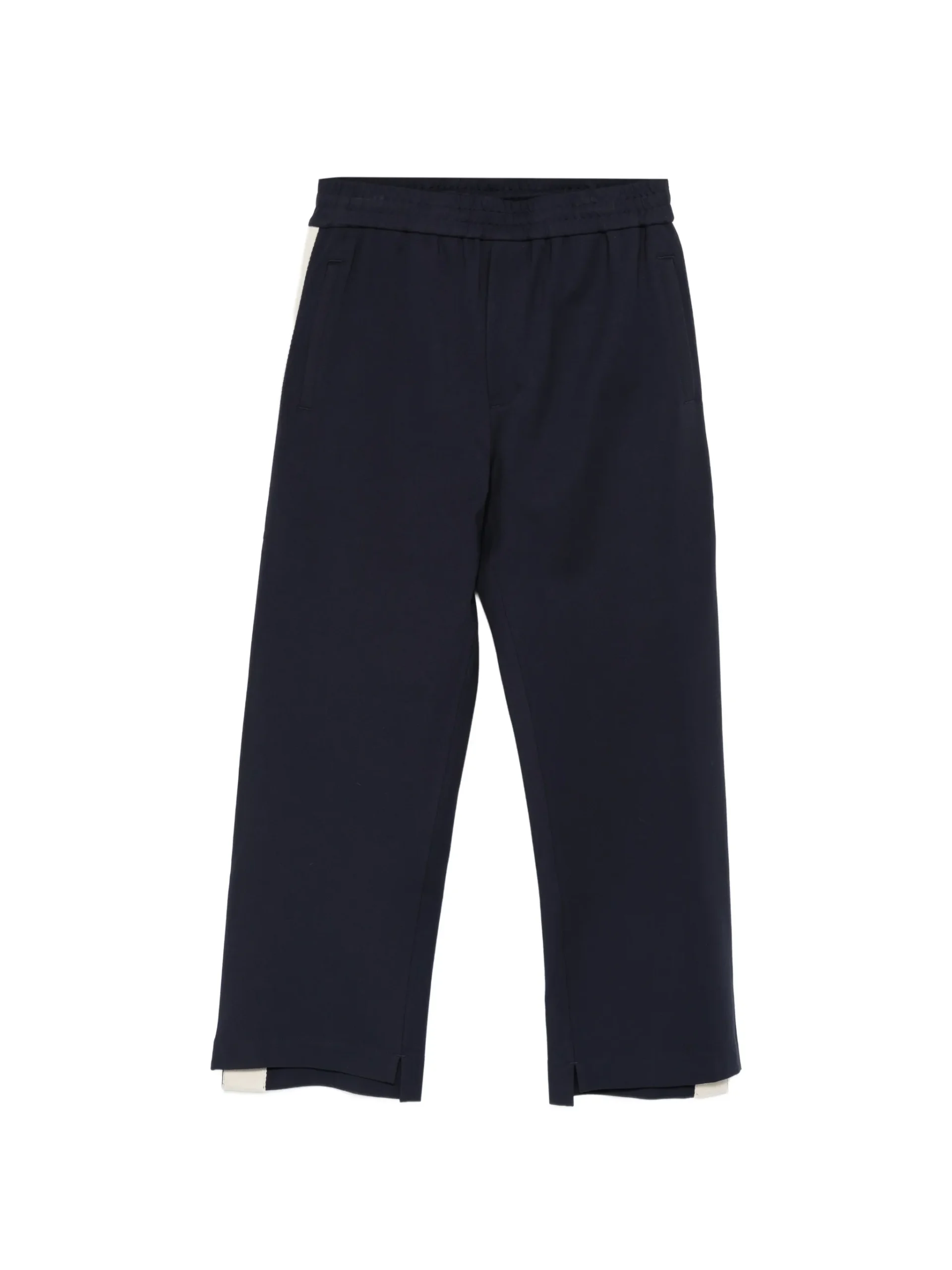 Pantaloni Axel Arigato albastri, cu talie elastica, buzunare laterale pe cusatura si detaliu cu slit. 68% vascoza 27% poliamida 5% elastan