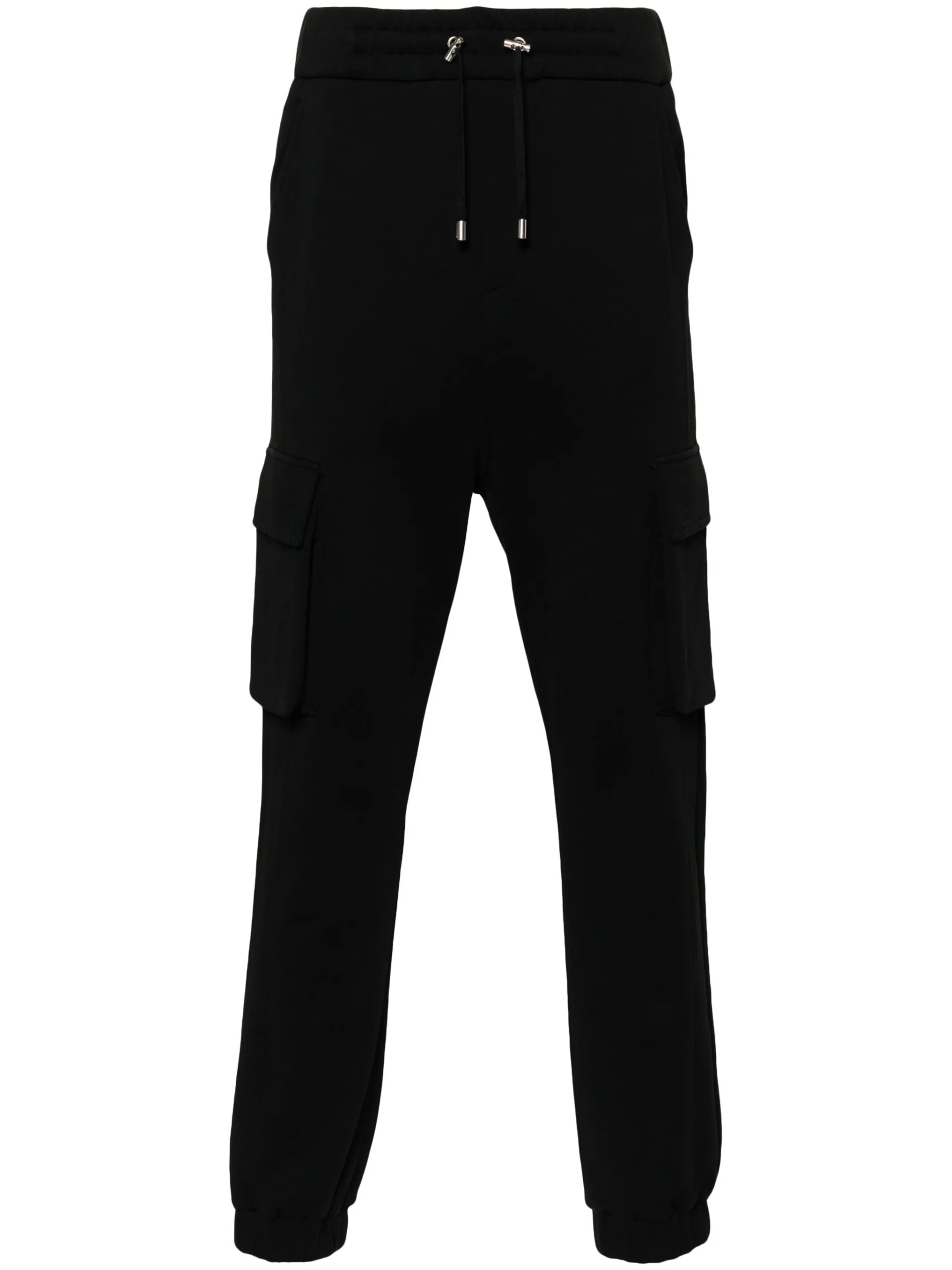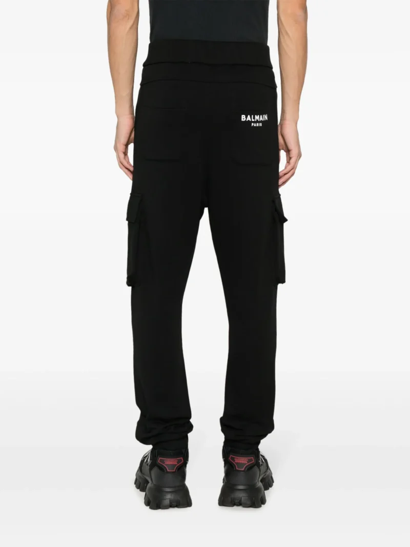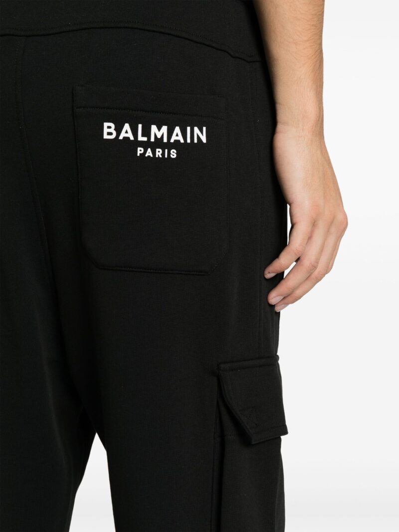 Pantaloni negri din bumbac, cu talie inalta, inchidere banda elastica si snur, logo Balmain pe partea din spate, buzunare laterale, buzunare la spate si tiv evazat. Potriviti pentru sezonul primavara/vara. 100% bumbac