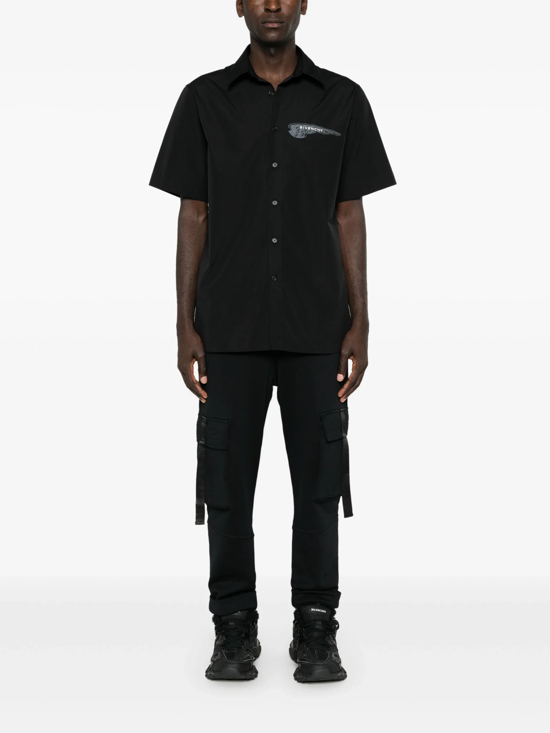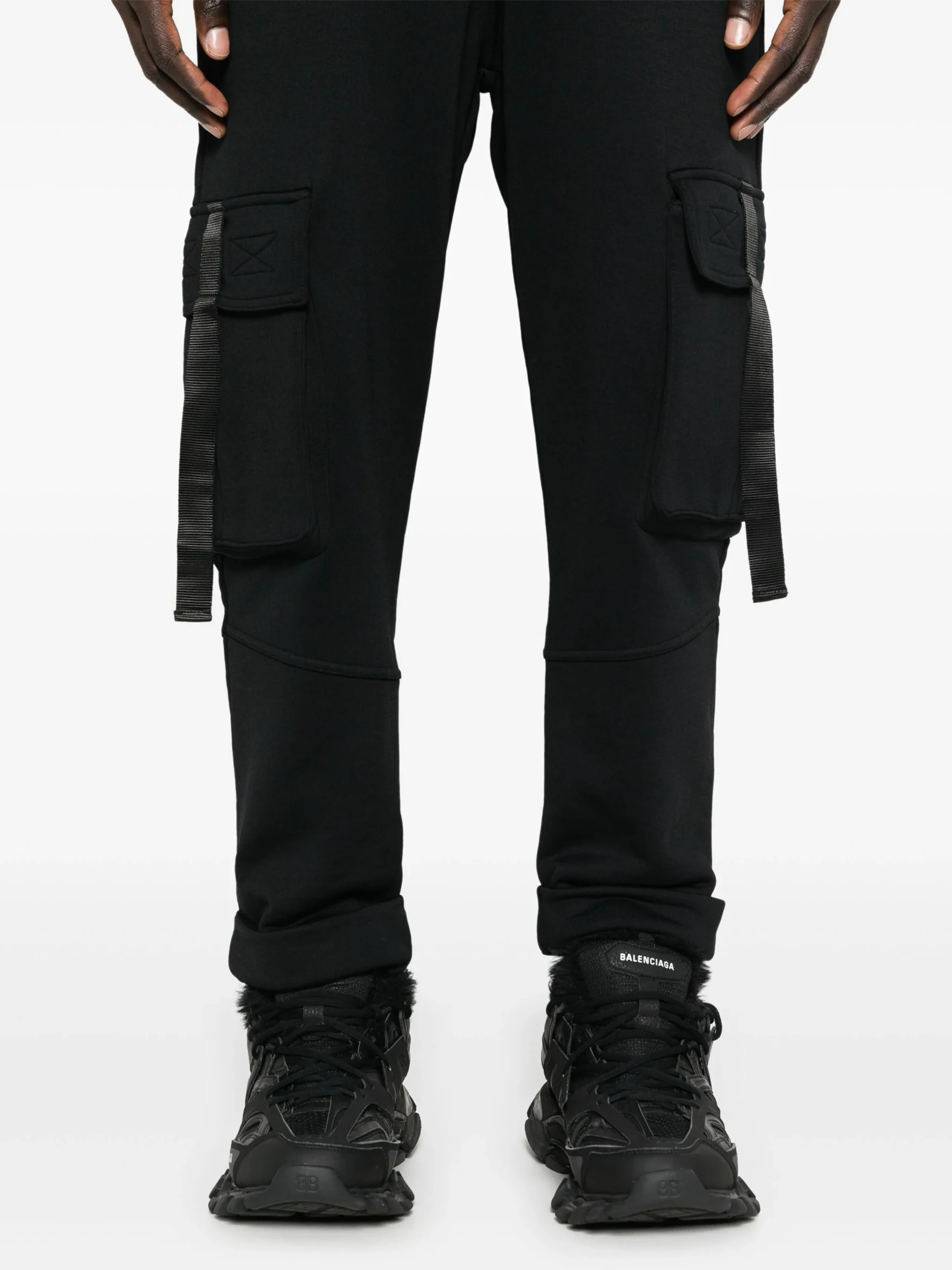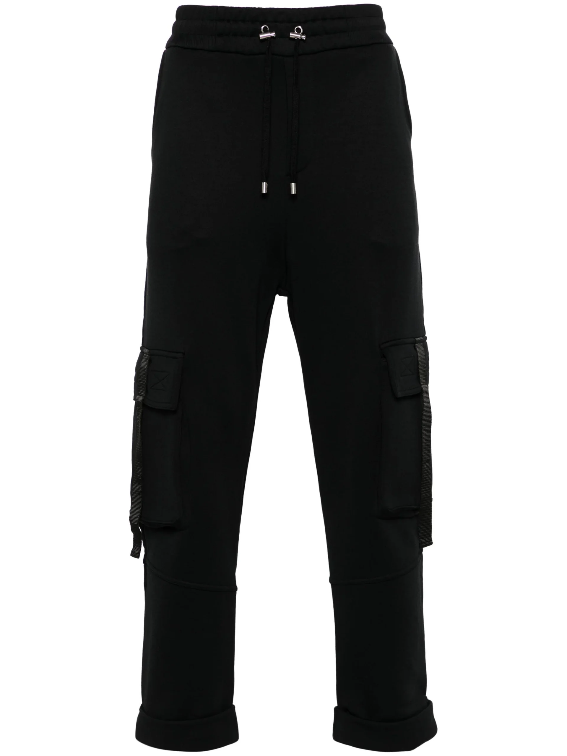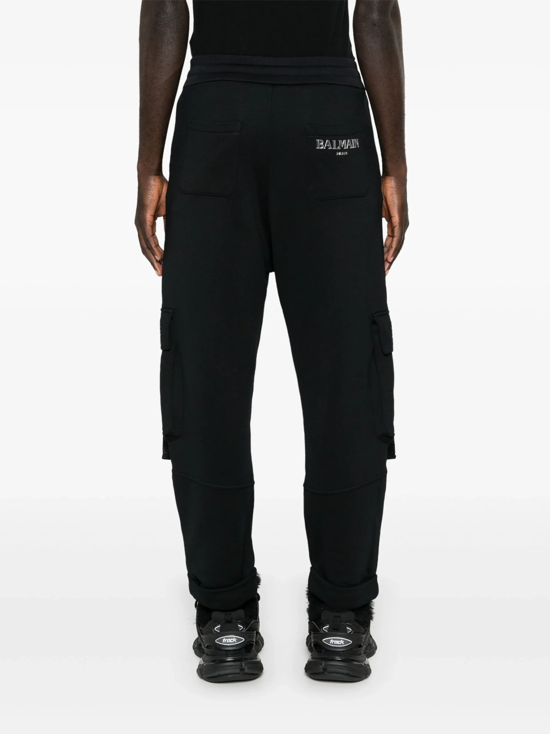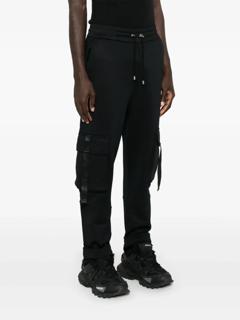 Pantaloni Balmain logo-lettering cargo negri, talie elastica, buzunare laterale, buzunare pe partea din fata si spate, logo grafic Balmain pe spate si tiv conic.59% poliamida 41% bumbac
