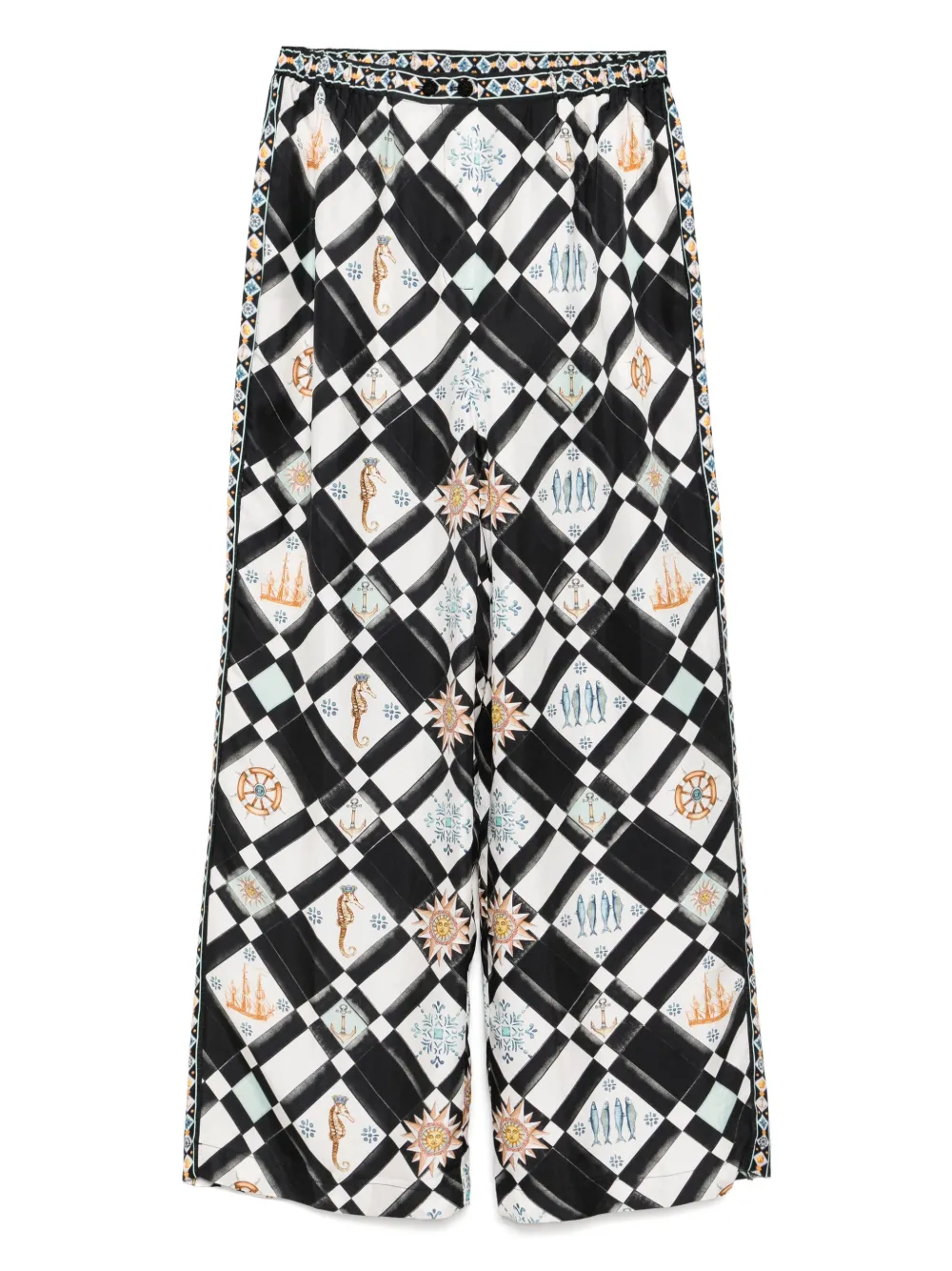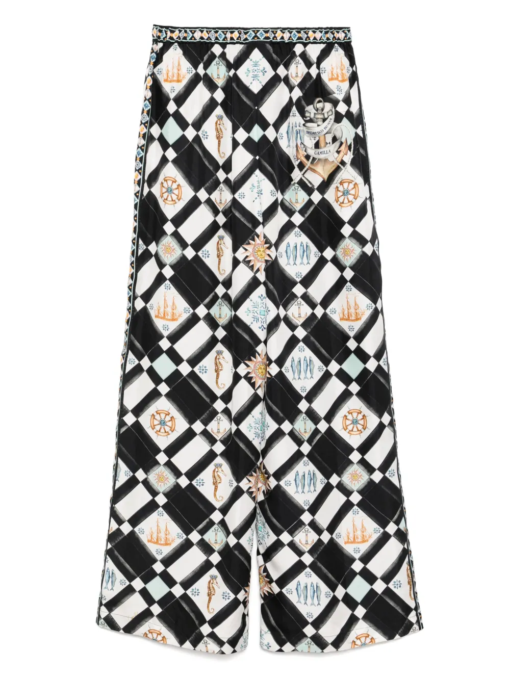 Pantaloni Camilla Folk Afloat multicolor, din matase, cu talie inalta, inchidere cu nasturi dubli, croiala wide, grafica imprimata pe toata suprafata produsului si tiv drept. Potriviti pentru sezonul primvara/vara. 100% matase.