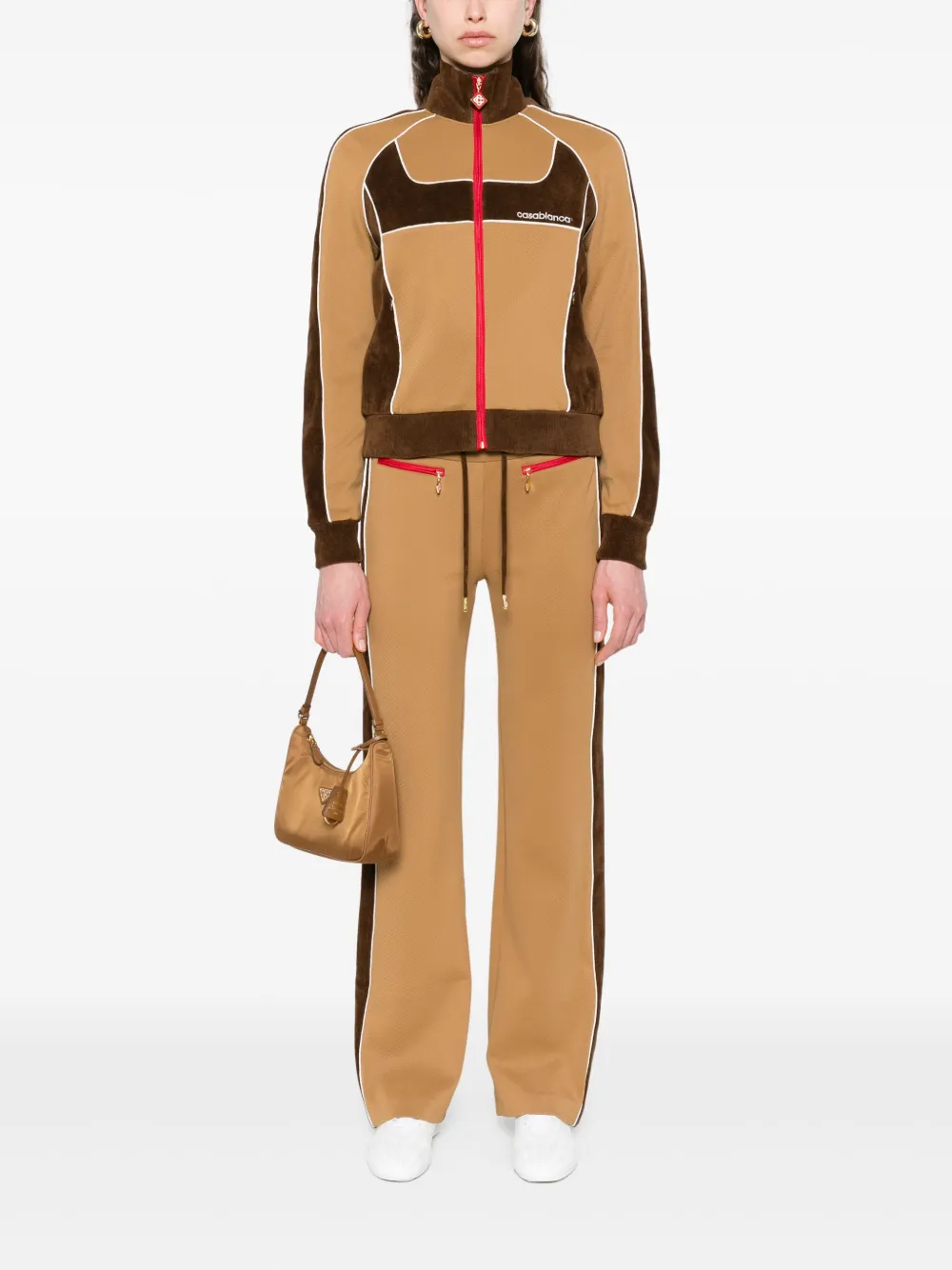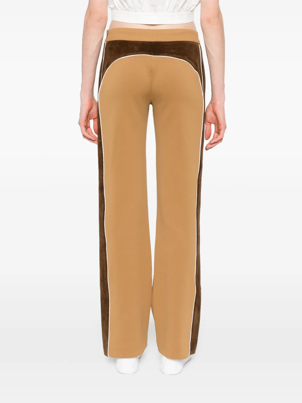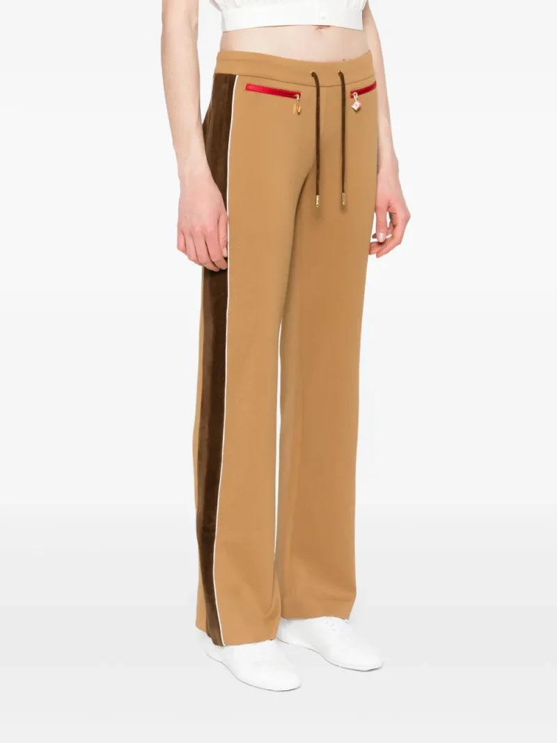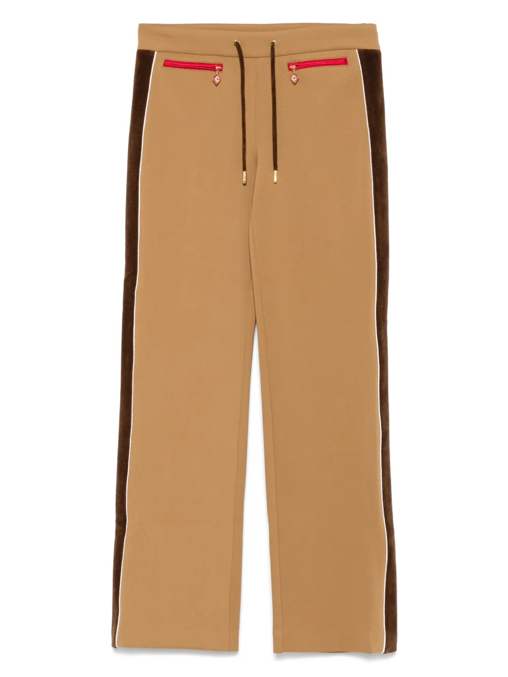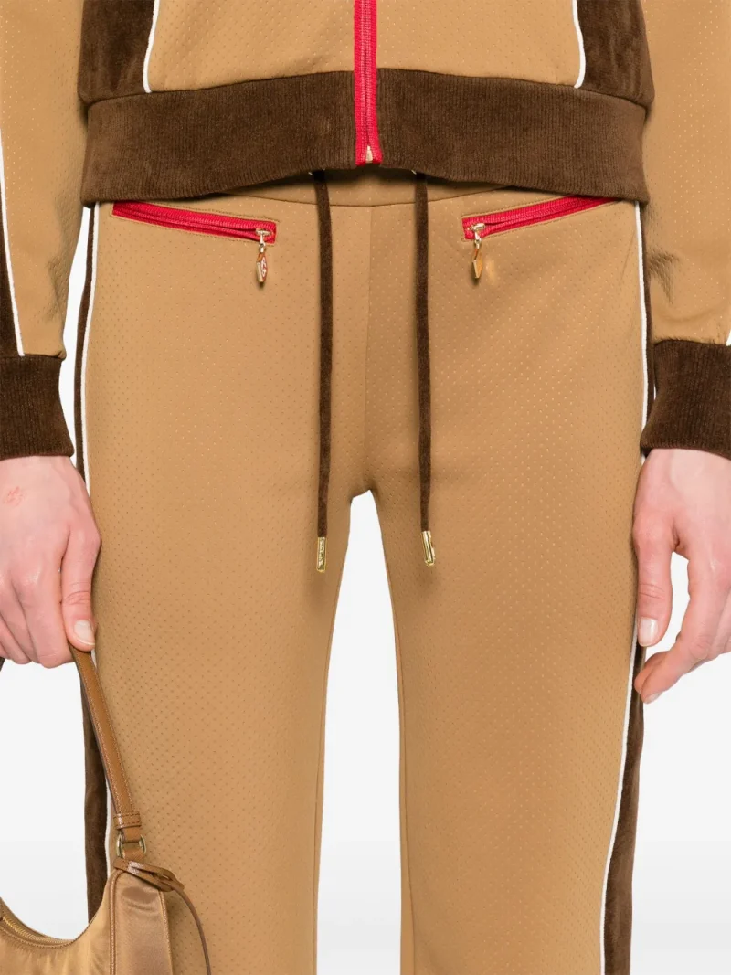 Pantaloni Casablanca Chenille Panelled Track maro, design in panouri contrastante, din poliester, cu talie elastica si inchidere snur, buzunare laterale cu fermoar si tiv drept. Potriviti pentru sezonul primavara/vara. 85% poliester; 100% poliester; 15% elastan.