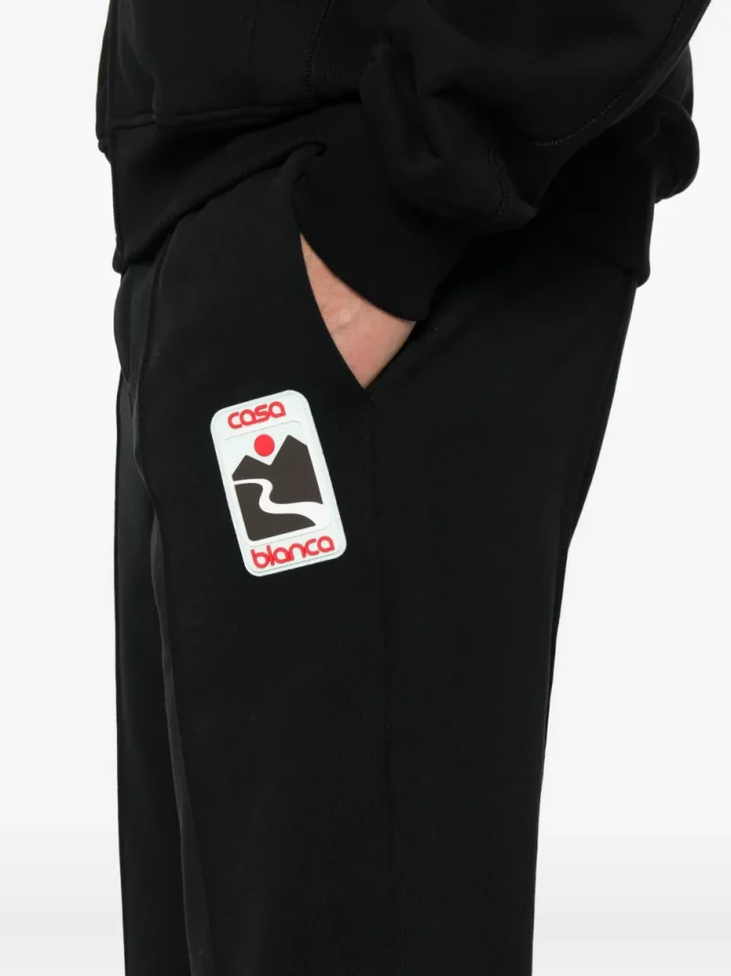 Pantaloni Casablanca Logo-Appliqué Drawstring Track negru, din bumbac, straight-fit, cu talie elastica si inchidere snur, logo brodat pe laterala si tiv drept. Potriviti pentru sezonul toamna/iarna. 100% bumbac organic; 100% bumbac oraganic.
