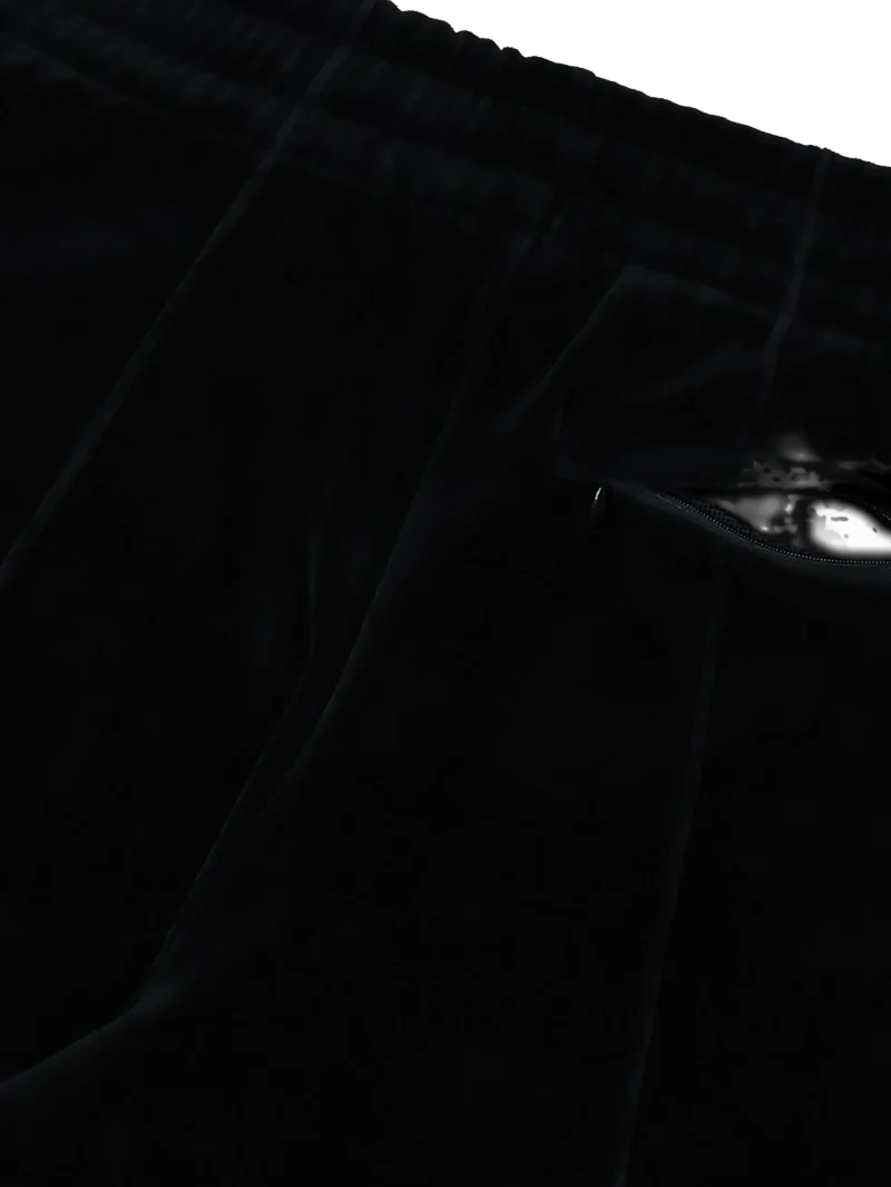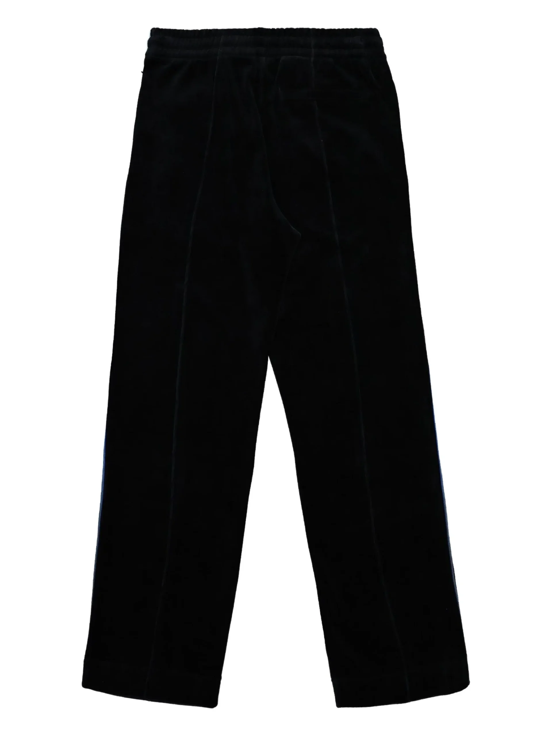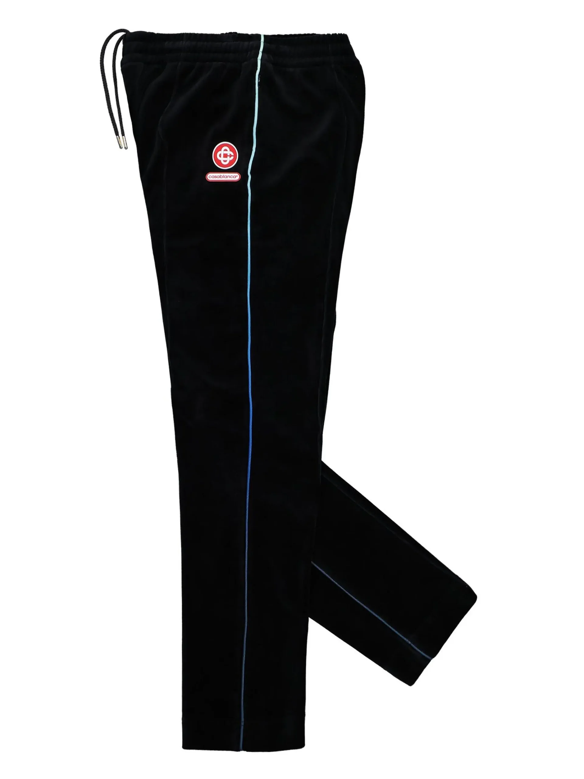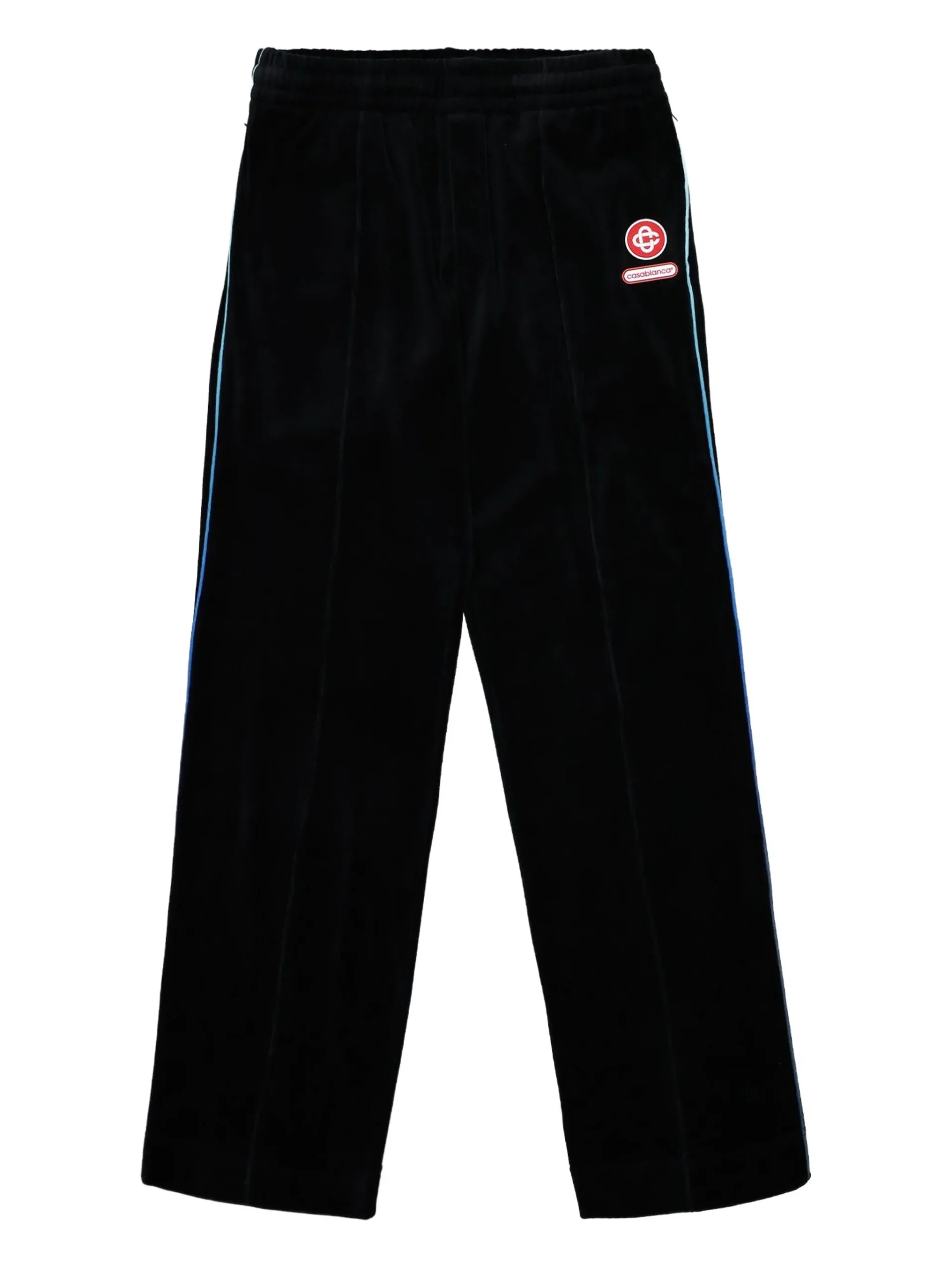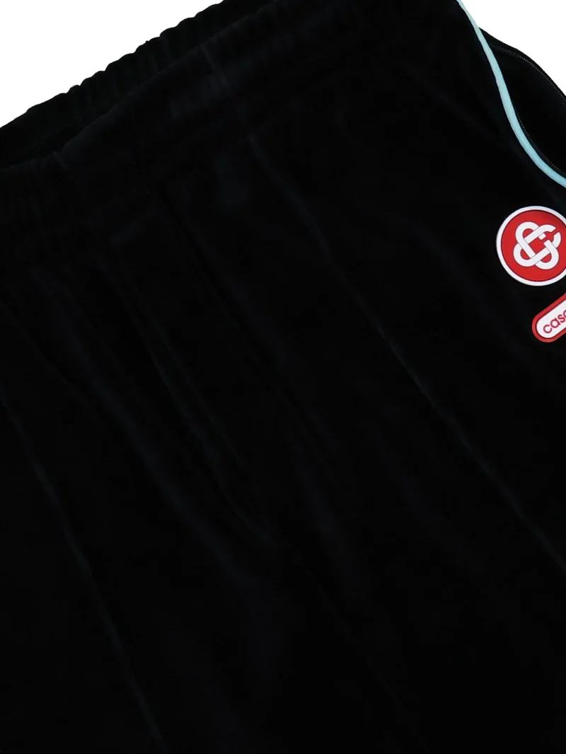 Pantaloni Casablanca side-stripe velour track negru, inchidere cu snur, logo Casablanca, tesatura velur, talie elastic si dunga laterala. 89% bumbac 11% poliamida