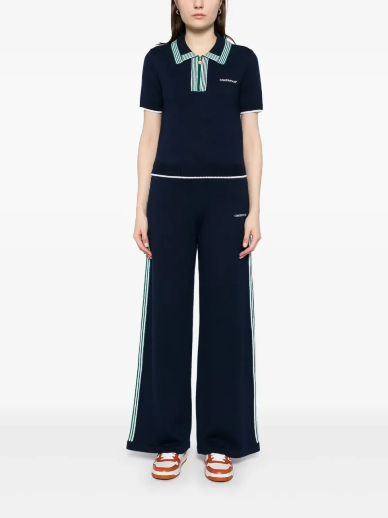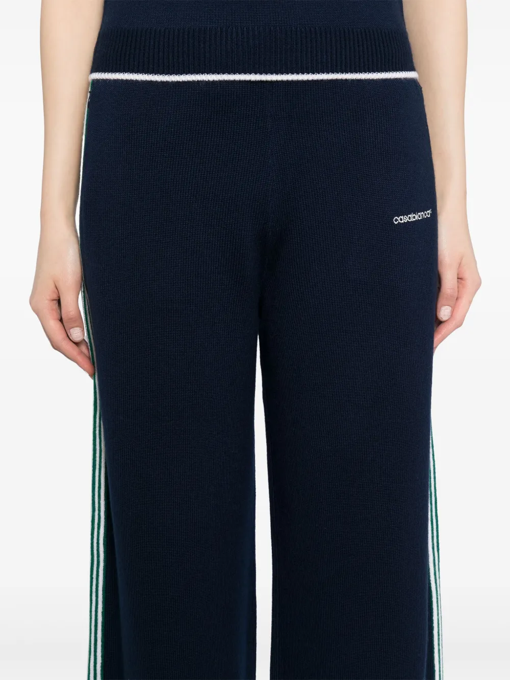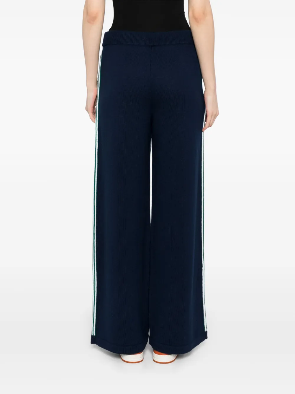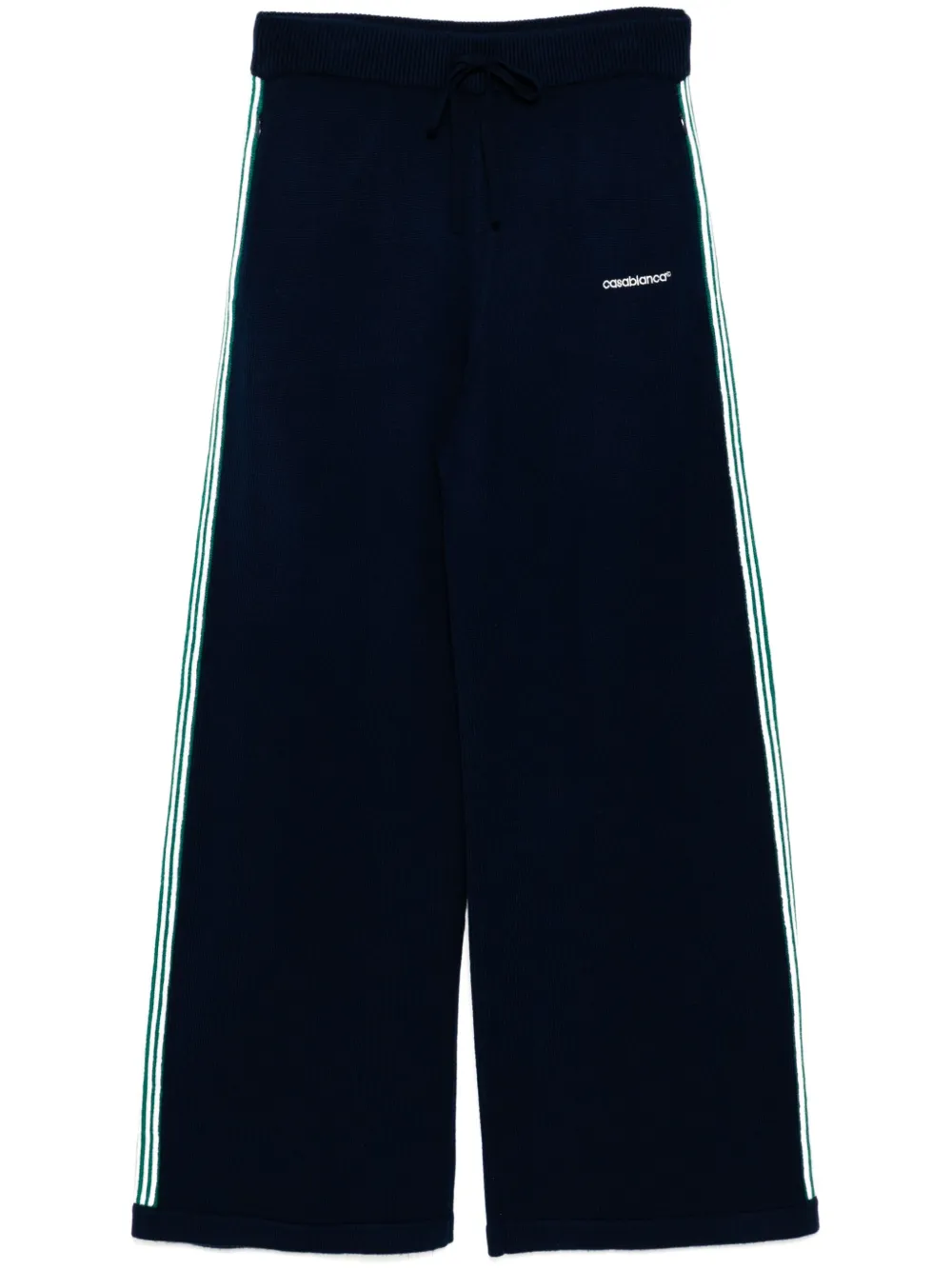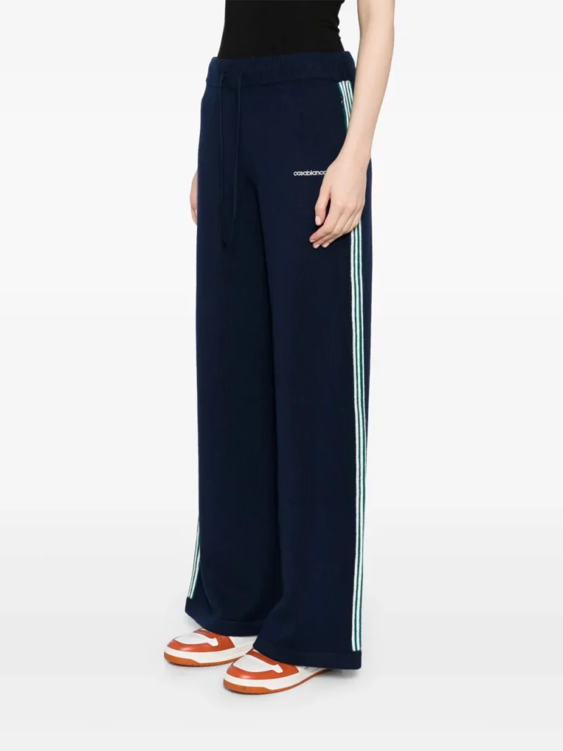 Pantaloni Casablanca Tennis bleumarin, construiti din lana, cu talie elastica, wide-fit, dungi laterale contrastante, logo Casablanca brodat si tiv drept. Potriviti pentru sezonul primavara/vara. 100% merino.