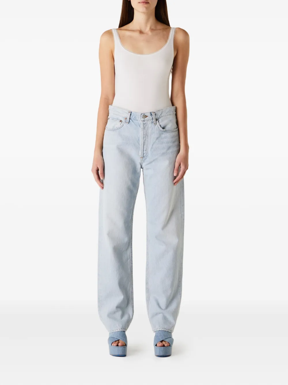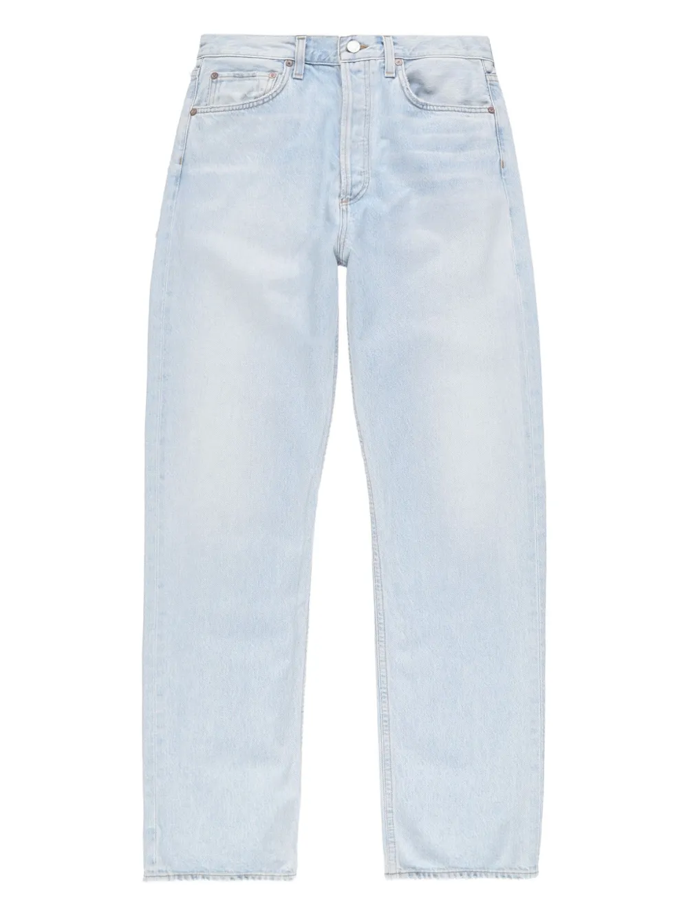 Pantaloni denim Agolde Kelly albastru, din denim, cu nchidere nasture si fermoar, buzunare „5-pockets”, croiala straight fit si tiv drept. Potriviti pentru sezonul toamnaa/iarna. 67% bumbac regenerativ; 11% bumbac reciclat; 22% lyocell.