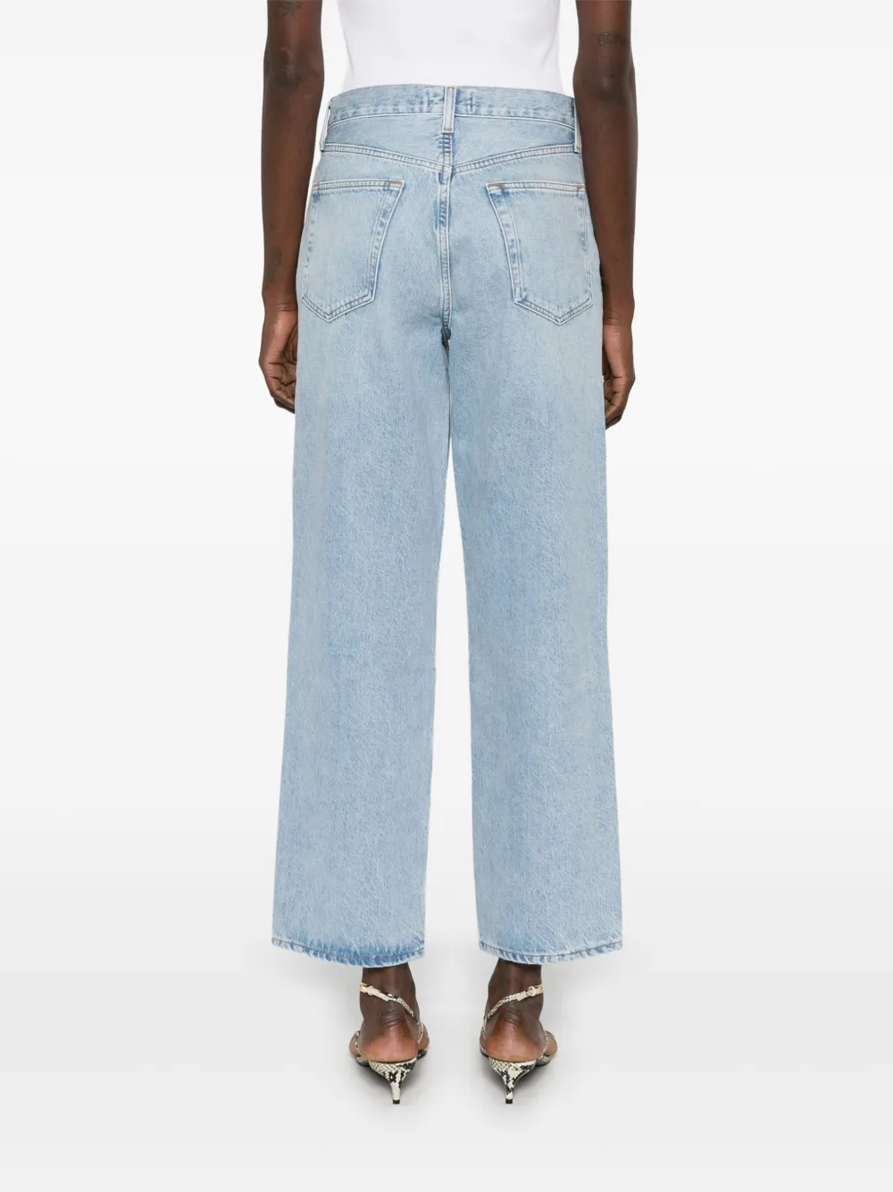 Pantaloni denim Agolde V-Waist albastru, din bumbac denim, cu talie sculptata in V, wide-fit, bootcut si tiv drept. Potriviti pentru sezonu toamna/iarna.