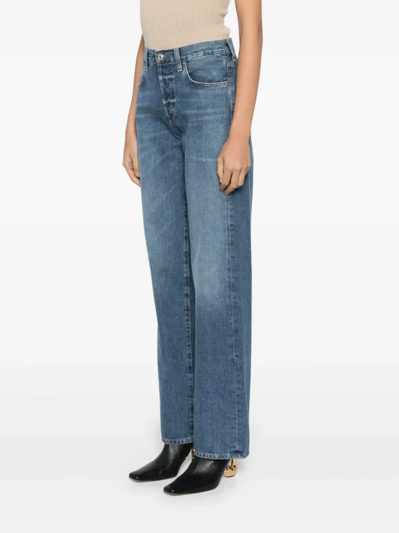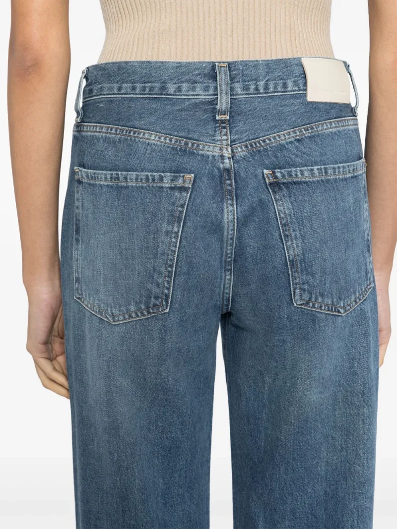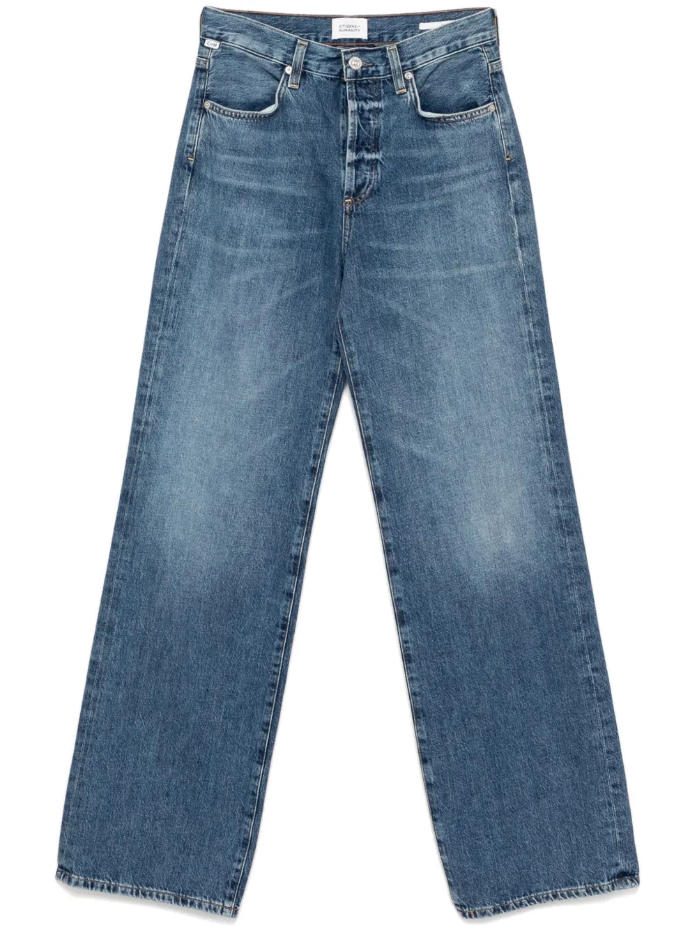 Pantaloni denim Citizens of Humanity Annina 33in albastru, cu inchidere nasture si fermoar, model „5-pockets”, eticheta logo cusuta la spate, aspect usor uzat si tiv drept. Potriviti pentru sezonul toamna/iarna. 100% bumbac.