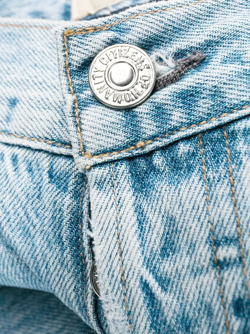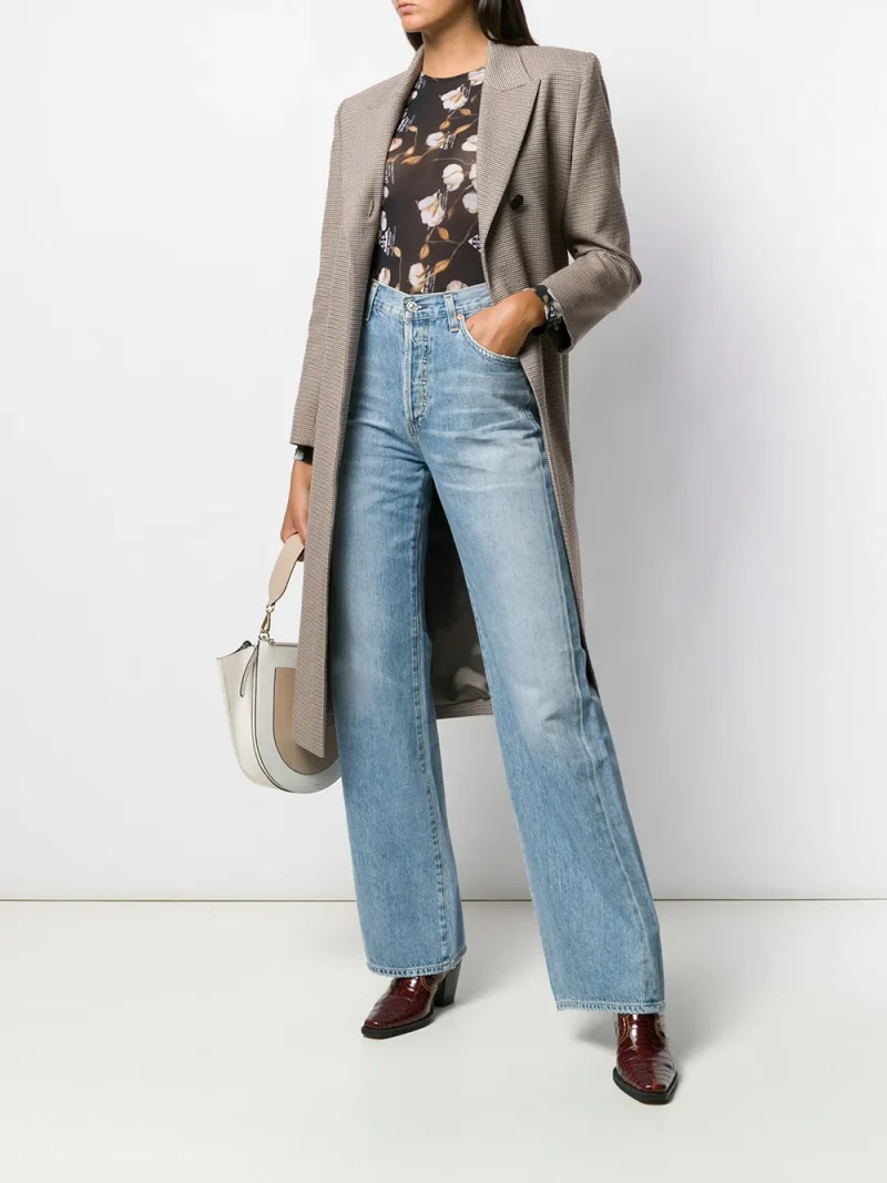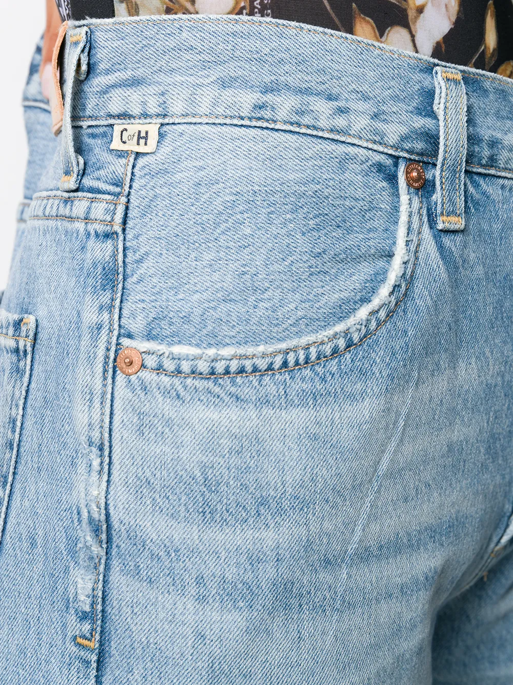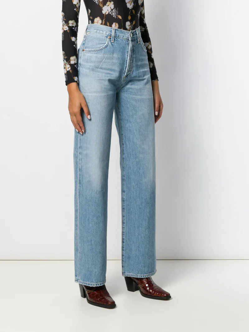 Pantaloni denim Citizens of Humanity Tula albastru, cu talie inalta, inchidere nasture si fermoar, buzunare laterale, buzunare si eticheta logo aplicate la spate, fit evazat si tiv drept. Potriviti penstru sezonul toamna/iarna. 100% bumbac organic.