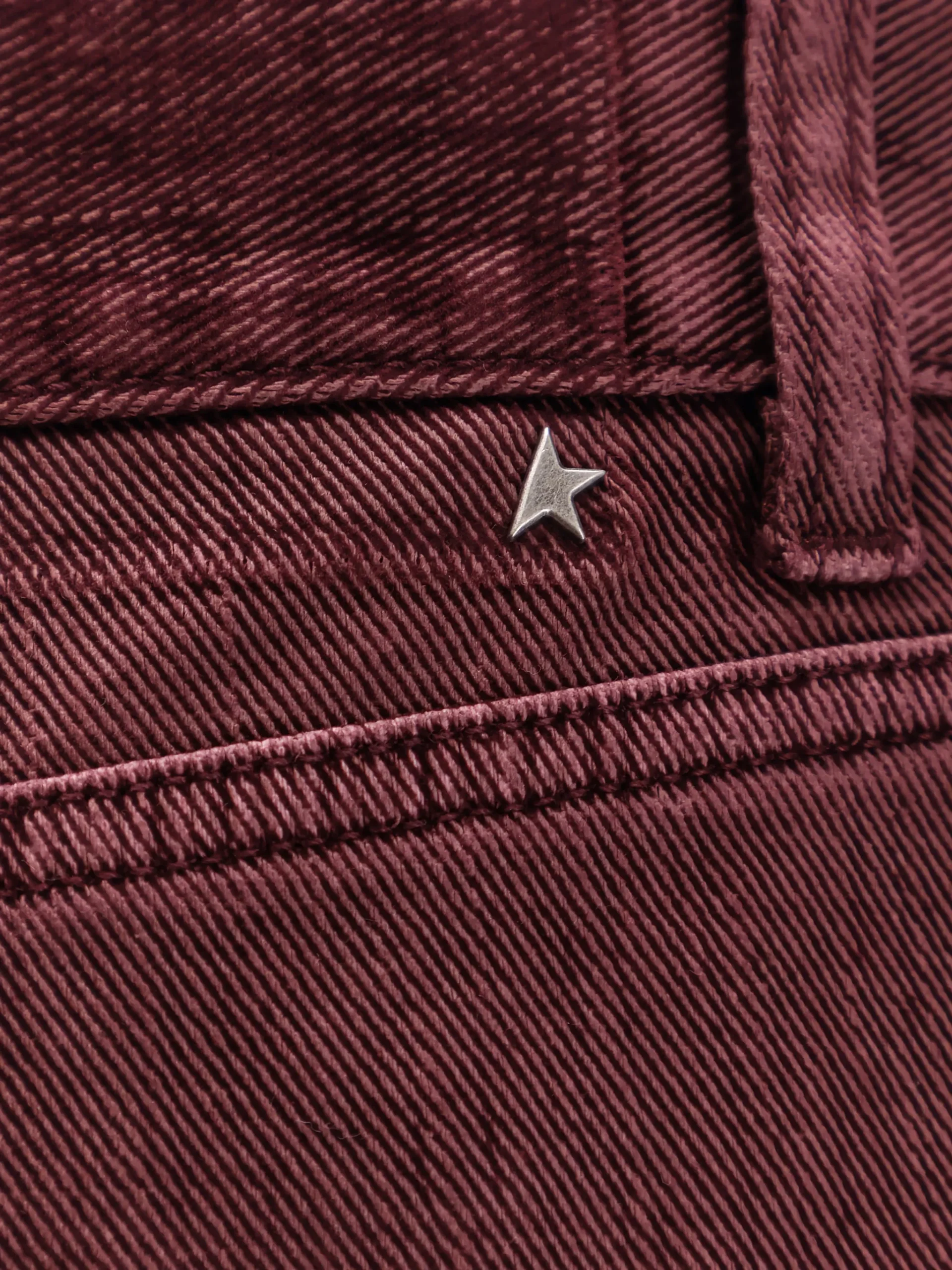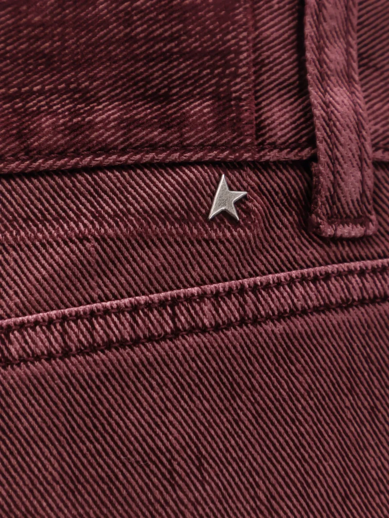 Pantaloni denim Golden Goose Star visiniu, realizati din bumbac denim, cu talie inalta, inchidere cu nasture si fermoar, model „5-pockets”, croiala evazata si tiv drept. Potriviti pentru sezonul primavara/vara. 100% bumbac.