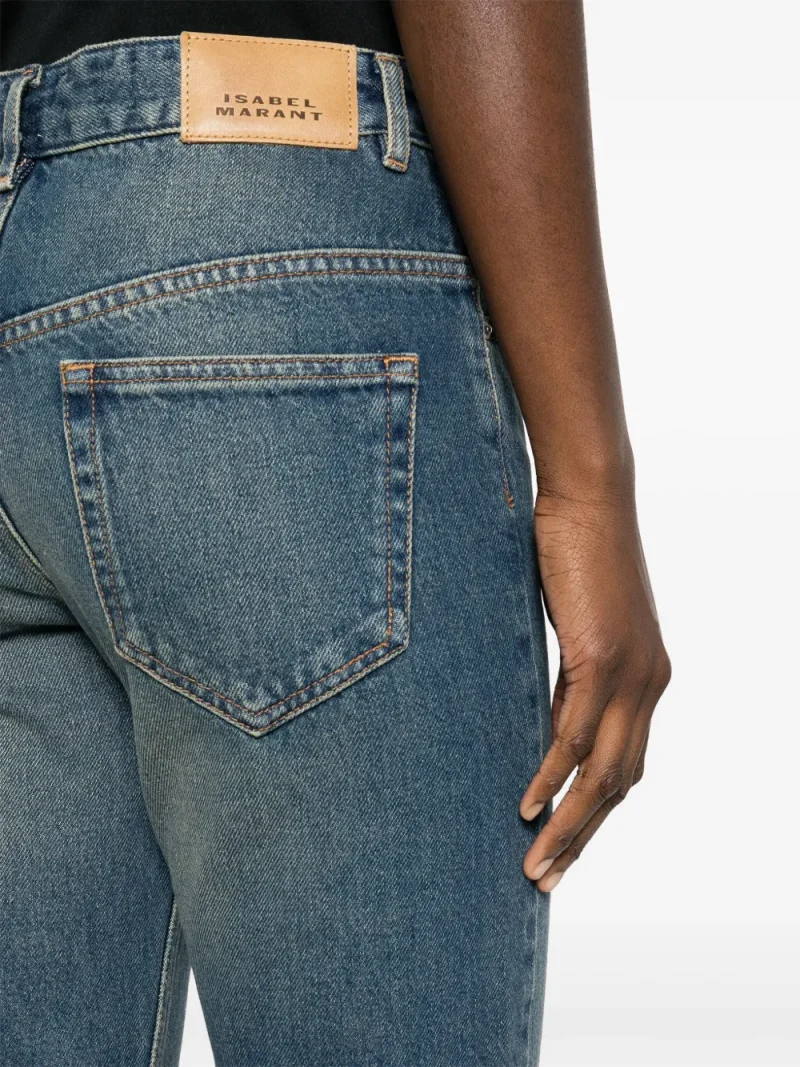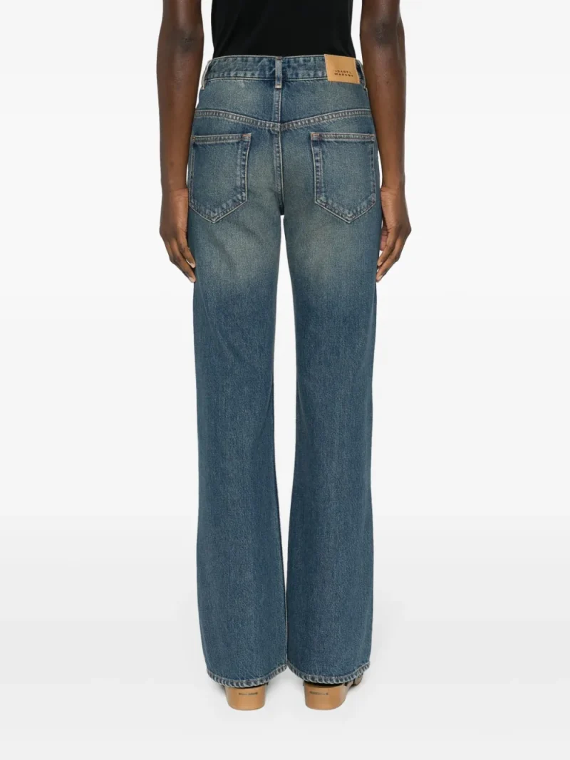 Pantaloni denim Isabel Marant Belvira High-Rise Bootcut albastru, cu talie inalta, inchidere cu nasture si fermoar, model „5-pockets”, aspect usor uzat si tiv drept. Potriviti pentru sezonul toamna/iarna. 100% bumbac denim.