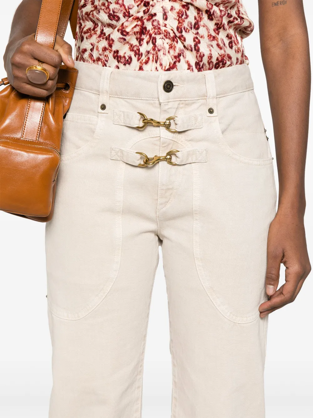 Pantaloni denim Isabel Marant Brinley ecru, straight-fit, din denim, cu talie joasa, inchidere cu nasture si fermoar, model „5-pockets”, decorati cu barete si carabine metalice, eticheta cu logo gravat la spate si tiv drept. Potriviti pentru sezonul toamna/iarna. 100% bumbac denim.
