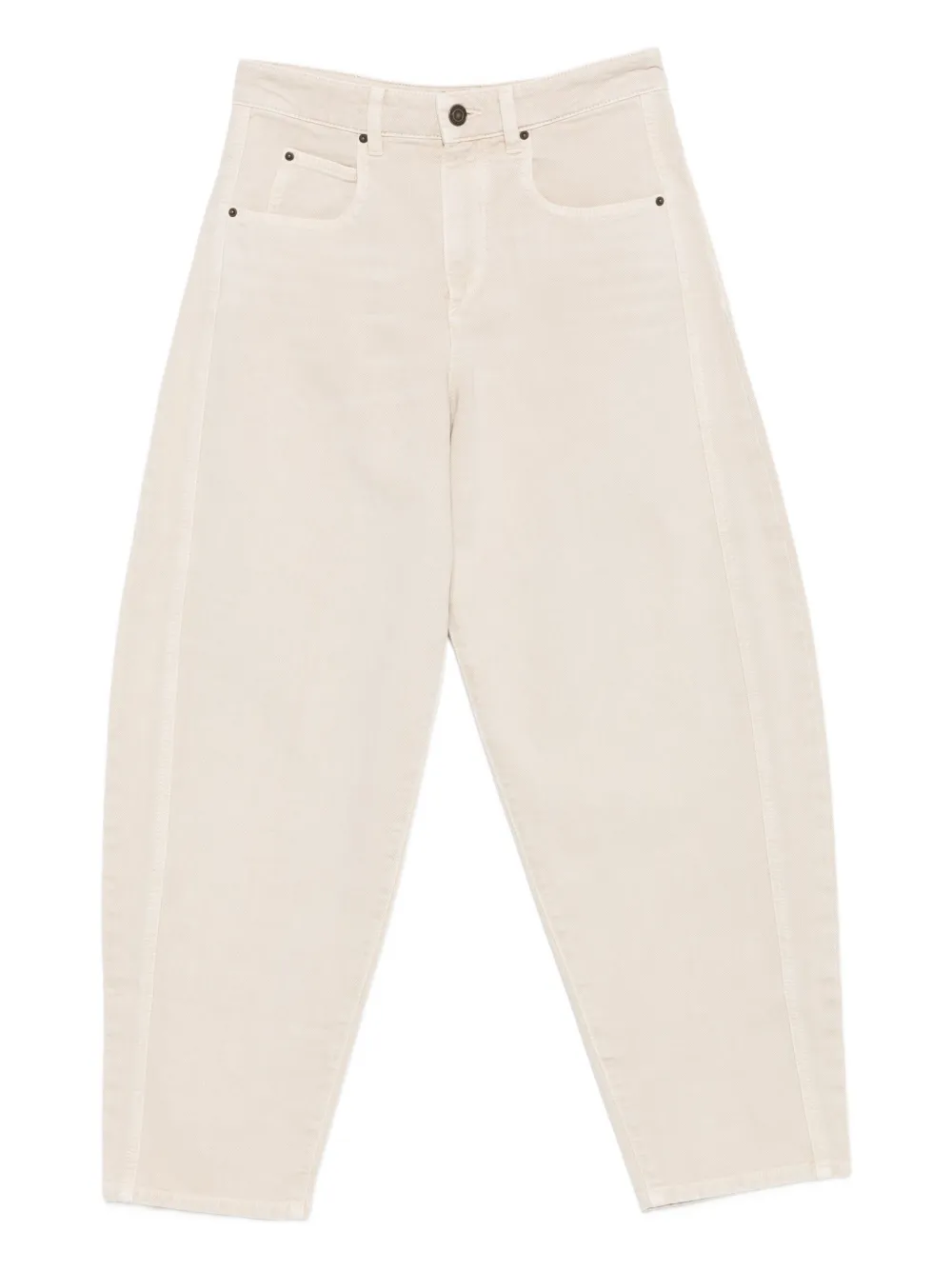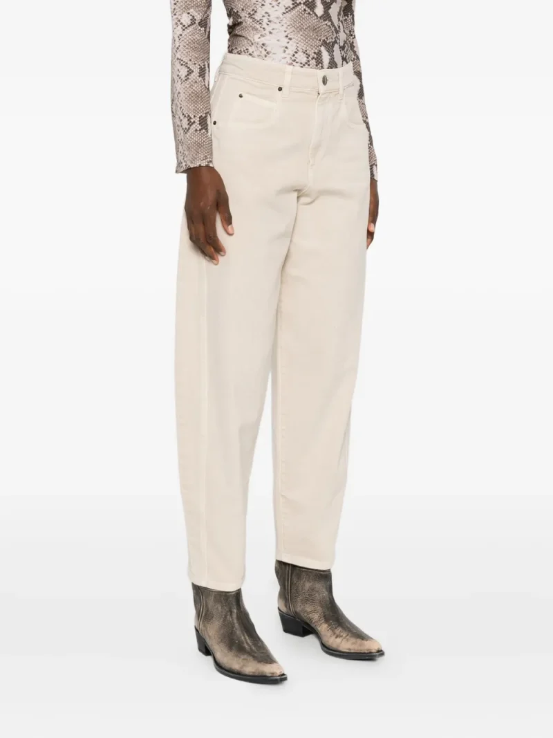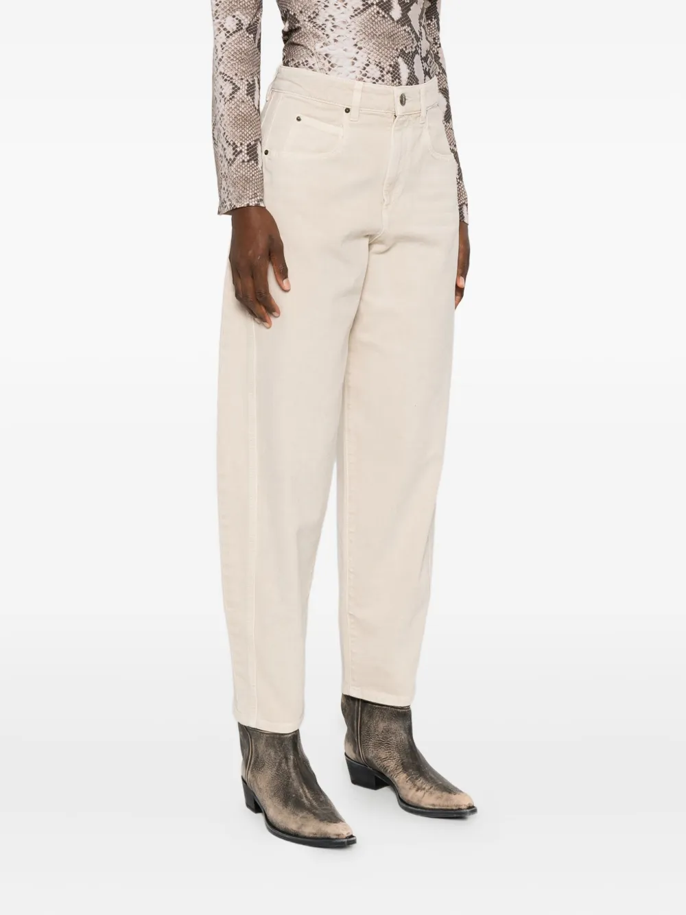 Pantaloni denim Isabel Marant Side-Seam Detail bej, barrel fit, cu talie inalta, inchidere cu nasture si fermoar, model „5-pockets”, cusaturi decorative si tiv drept. Potriviti pentru sezonul toamna/iarna. 80% bumbac; 20% canepa; 100% bumbac.