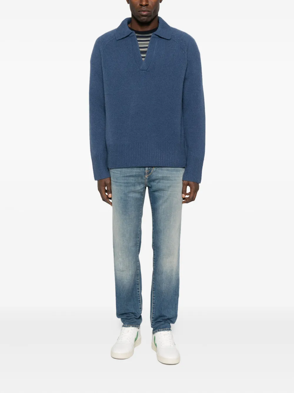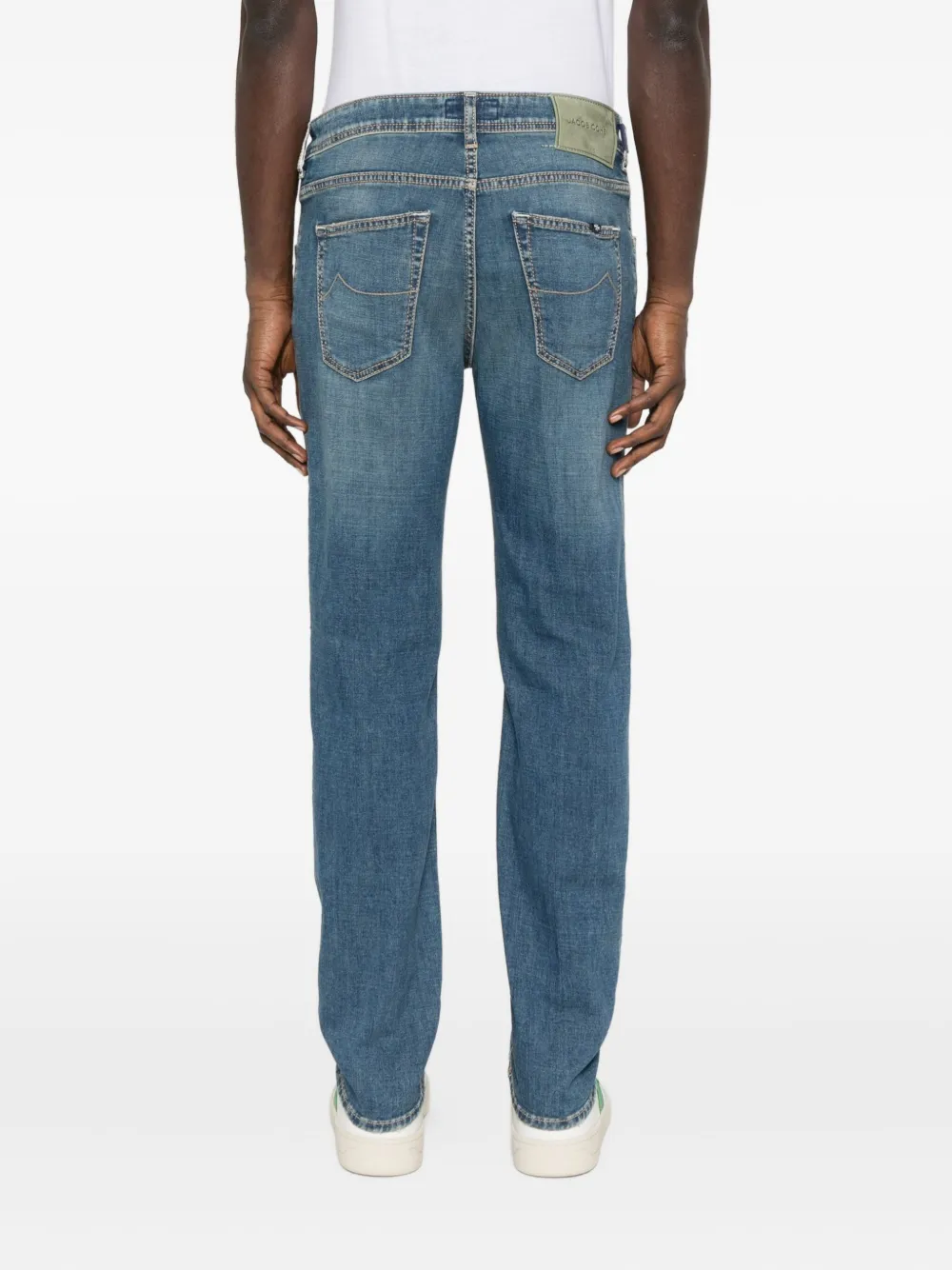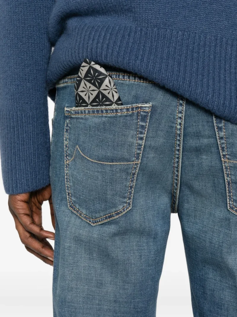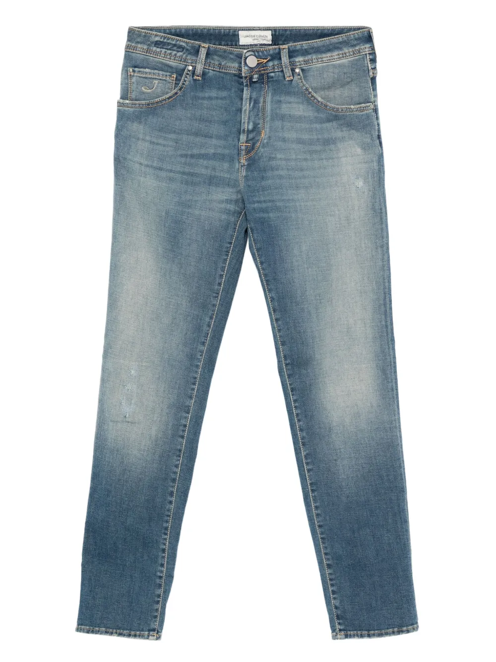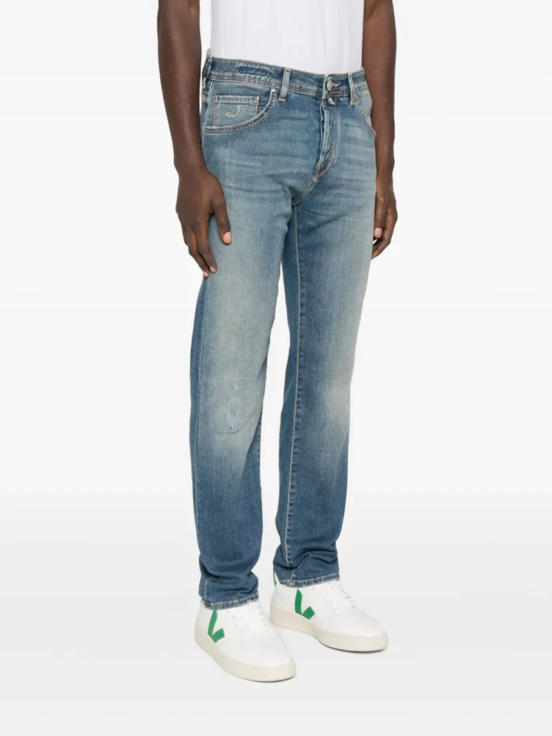 Pantaloni denim Jacob Cohen Faded Distressed albastru, realizati din denim premium japonez, cu inchidere nasture si fermoar, model „5-pockets”, esarfa iconica Jacob Cohen la spate si tiv drept. Potrivita pentru sezonul toamna/iarna. 92% bumbac; 6% vascoza; 2% elastan.