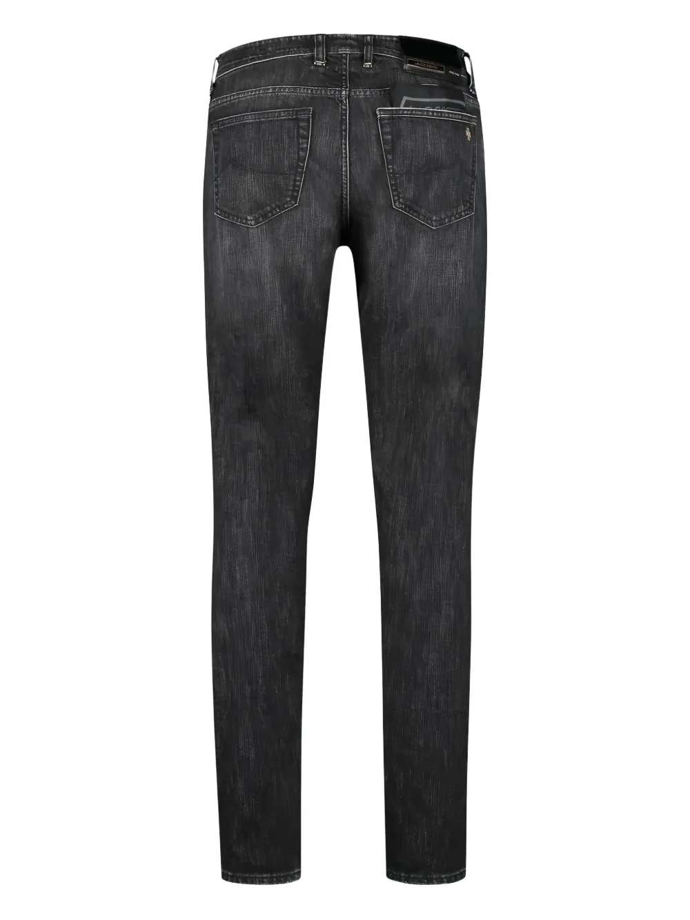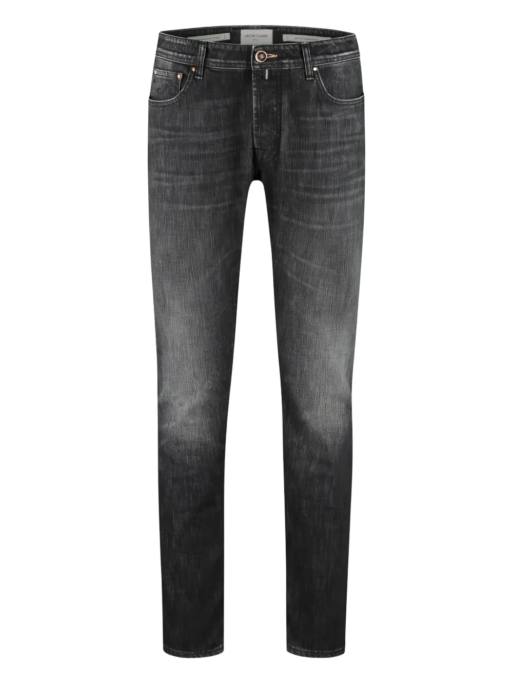 Pantaloni denim Jacob Cohen Faded-Effect Slim-Fit negru, realizati artizanal din denim japonez kurabo, cu inchidere nasture si fermoar, model „5-pockets”, tailoring de inspiratie italiana si aspect uzat. Potriviti pentru sezonul toamna/iarna. 90% bumbac; 10% poliester.