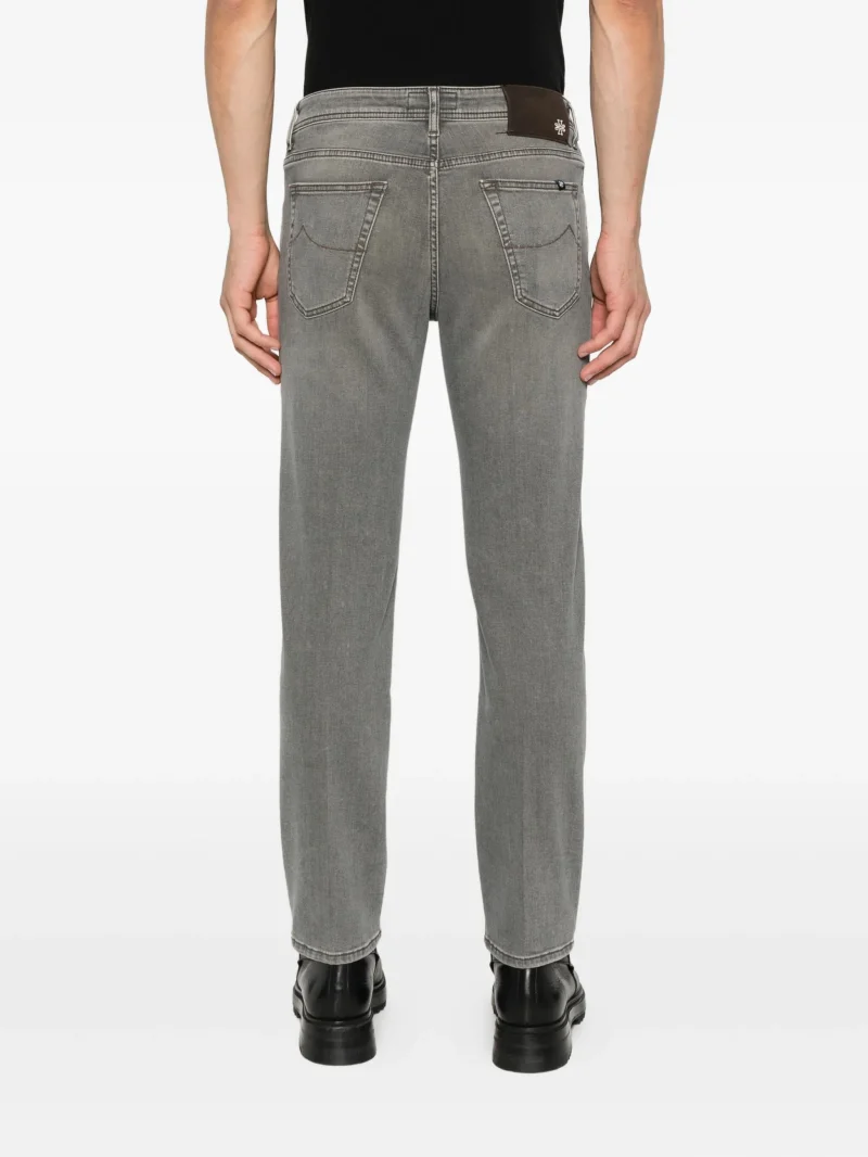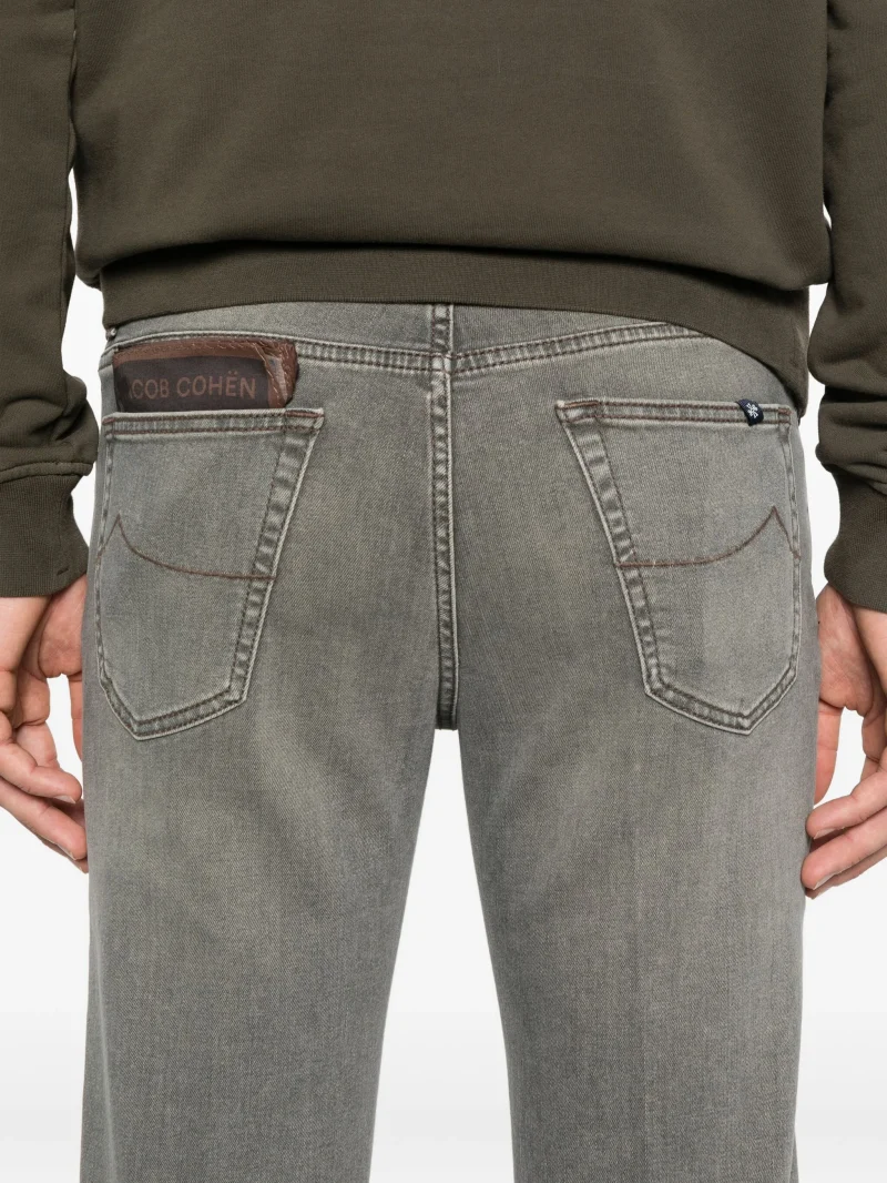 Pantaloni denim Jacob Cohen Five-Pocket gri, cu inchidere nasture si fermoar, model „5-pockets”, eticheta cu logo cusuta la spate si tiv drept. Potriviti pentru sezonul toamna/iarna. 92% bumbac; 6% vascoza; 2% elastan.