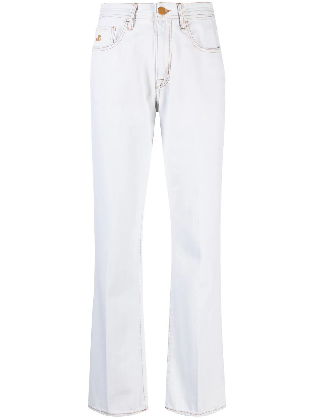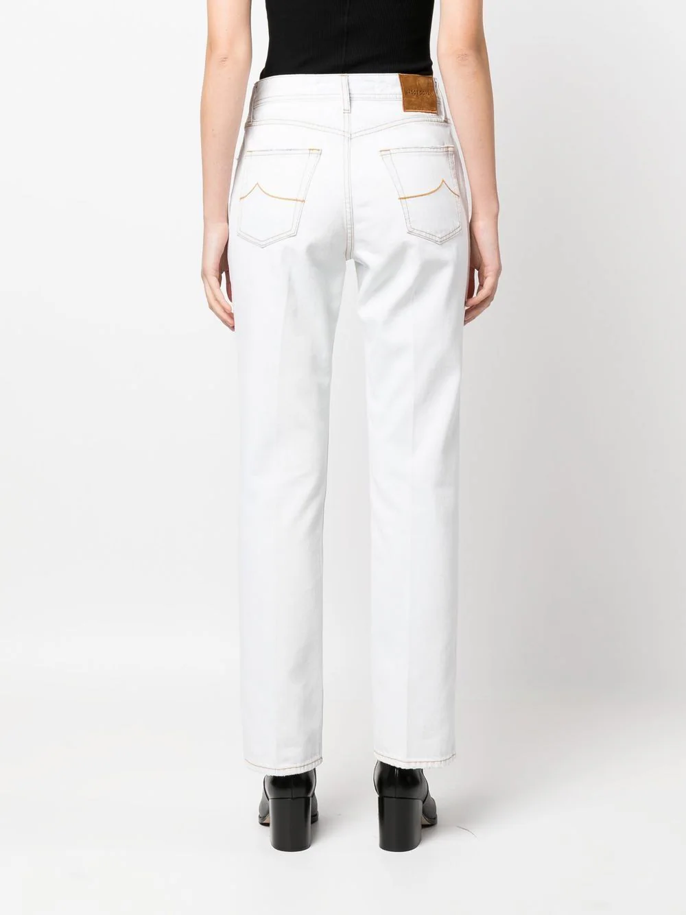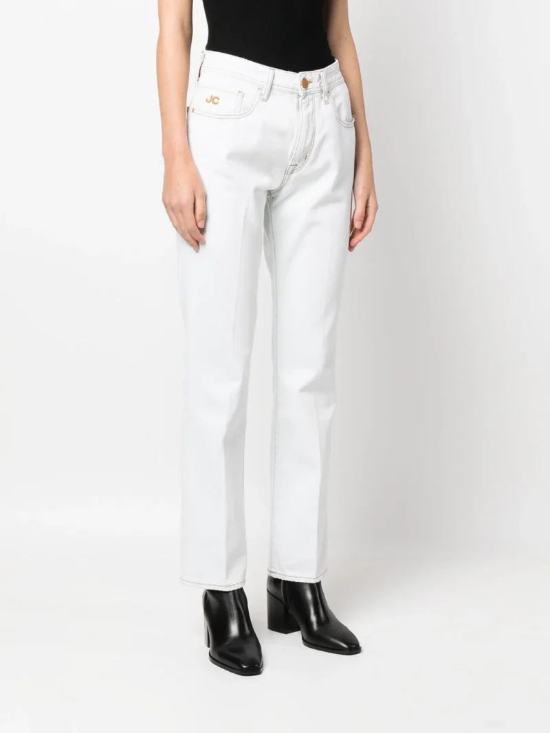 Pantaloni albi din bumbac denim, straight fit, cu talie inalta, inchidere cu nasture si fermoar, croaia „5-pockets”, eticheta logo Jacob Cohen cusuta la spate, aspect usor uzat si tiv drept. Potriviti pentru sezonul toamna/iarna. Detalii: Model- Kate; Straight fit; Talie inalta; Interior- 78 cm; tiv- 21 cm. 100% bumbac denim.