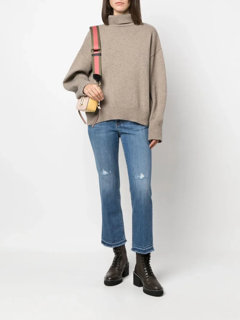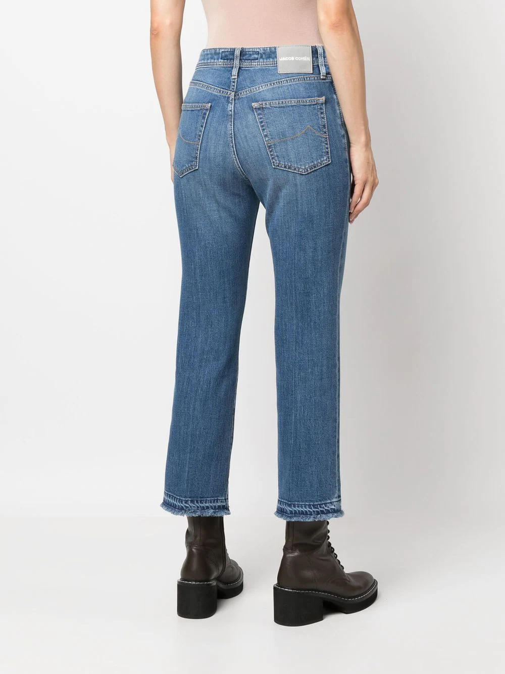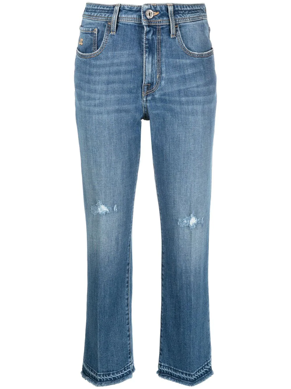 Pantaloni albastri din bumbac denim, straight fit, cu talie inalta, inchidere cu nasture si fermoar, croaia “5-pockets”, eticheta logo Jacob Cohen cusuta la spate, aspect usor decolorat uzat si tiv drept cu franjuri. Potriviti pentru sezonul toamna/iarna. Detalii: Model- Kate Crop; Straight fit; Talie inalta; Interior- 69 cm; tiv- 21 cm. 98% bumbac denim; 2% elastan.
