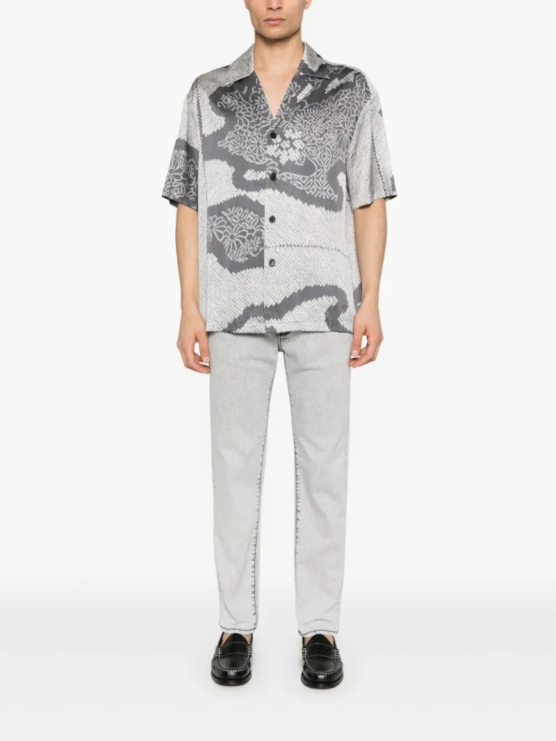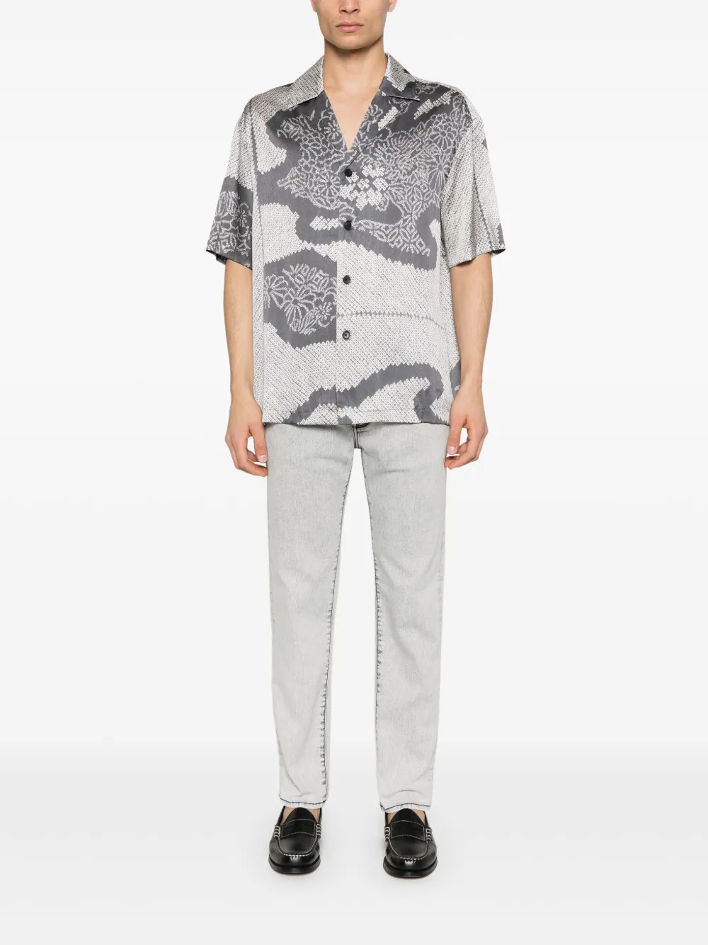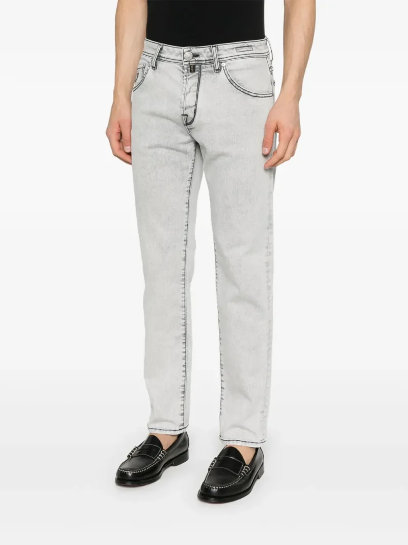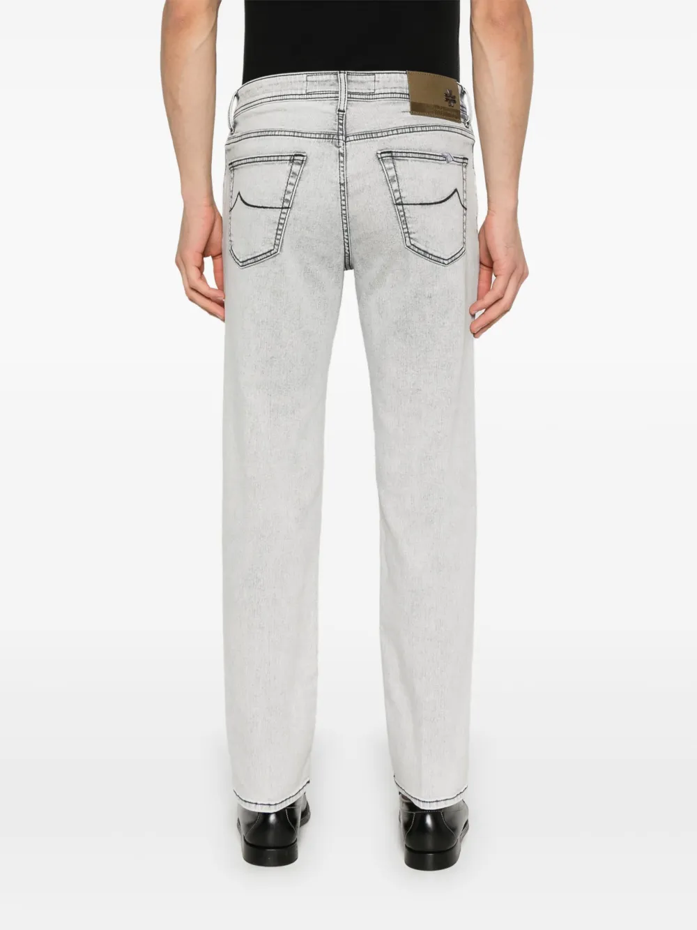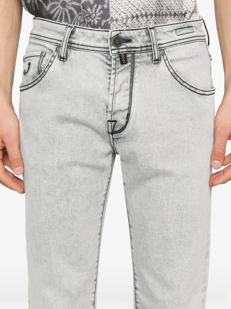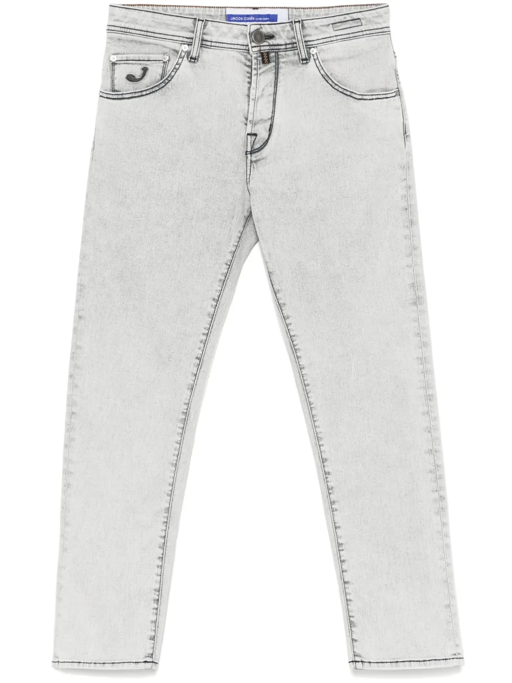 Pantaloni denim Jacob Cohën Logo-Embroidered gri, din bumbac denim, cu inchidere nasture si fermoar, model „5-pockets”, eticheta cu logo Jacob Cohen aplicata la spate si tiv drept. Potriviti pentru sezonul primavara/vara. 92% elastan; 8% bumbac.