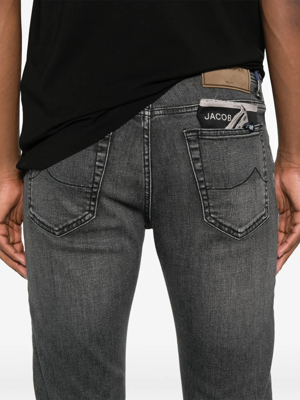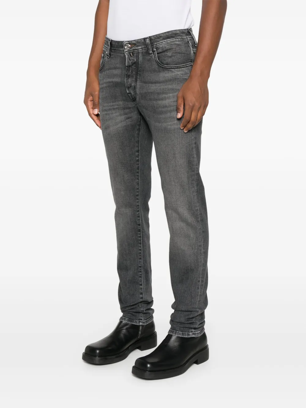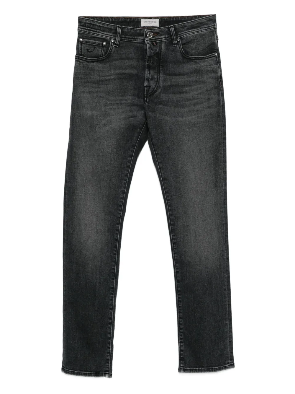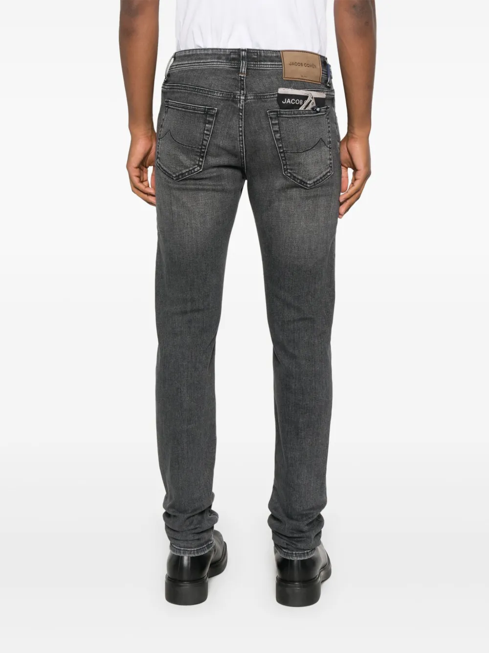 Pantaloni denim Jacob Cohen Logo-Patch gri, cu inchidere nasture si fermoar, model „5-pockets”, logo patch la spate si aspect usor uzat. Potriviti pentru sezonul toamna/iarna. 94% bumbac; 4% poliester; 2% elastan.