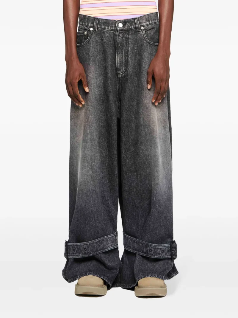 Pantaloni denim JW Anderson Buckled-Cuff gri, din bumbac denim, cu inchidere nasture si fermoar, model „5-pockets”, eticheta din piele cu logo JWA gravat, croiala oversized, curea detasabila decorativa si tiv drept. Potriviti pentru sezonul primavara/vara. 65% poliester; 35% bumbac; 100% bumbac.
