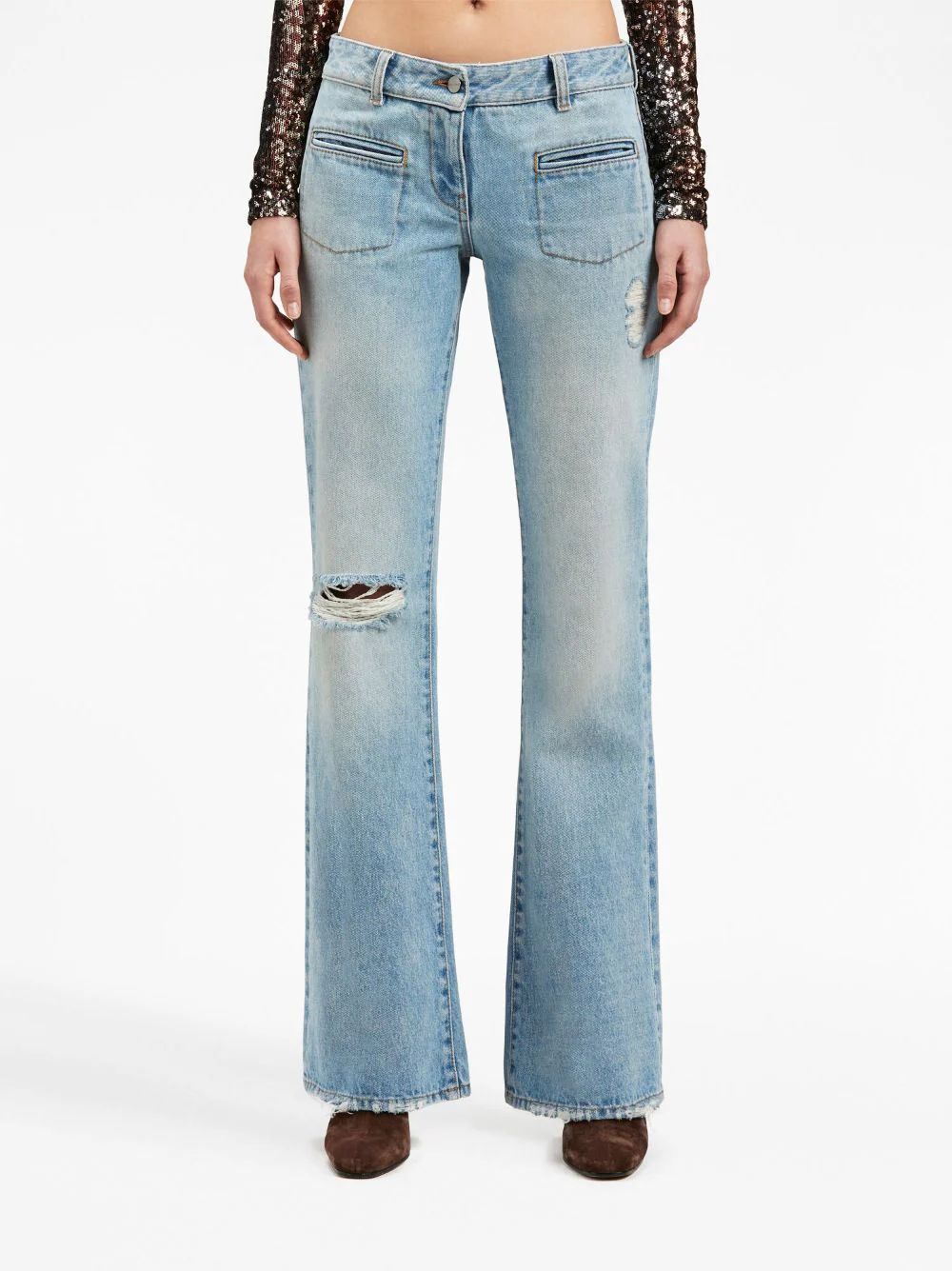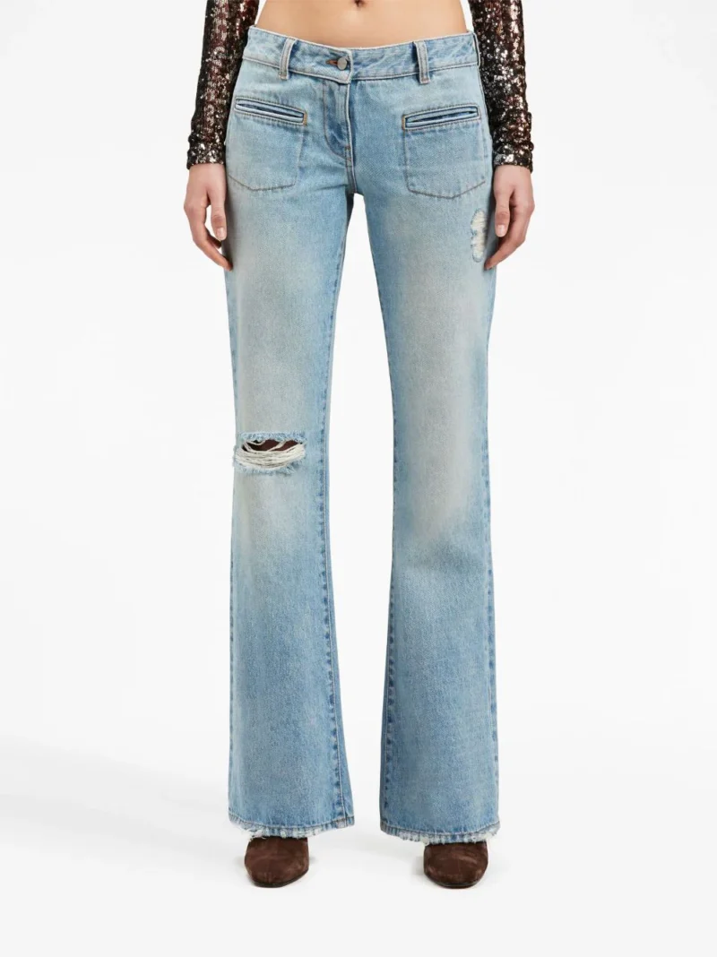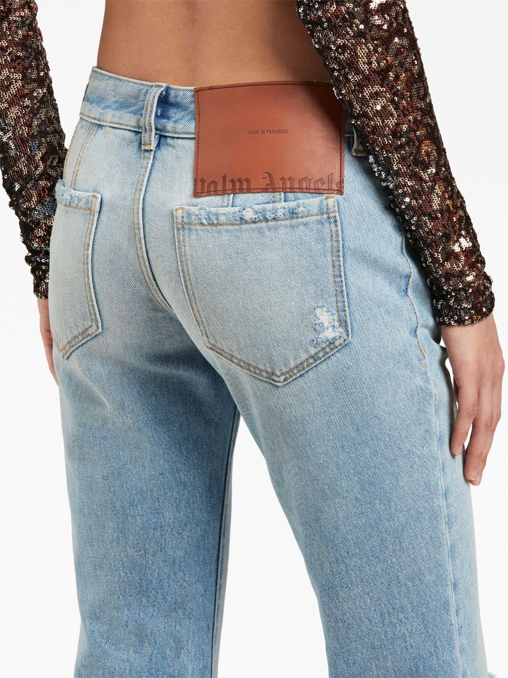 Pantaloni albastri din bumbac denim, cu talie joasa, croiala bootcut leg, inchidere cu nasture si fermoar, eticheta Palm Angels din piele cusuta la spate, buzunare pe partea din fata, buzunare la spate si aspect uzat. Potriviti pentru sezonul toamna/iarna. 100% bumbac; 65% poliester; 35% bumbac.