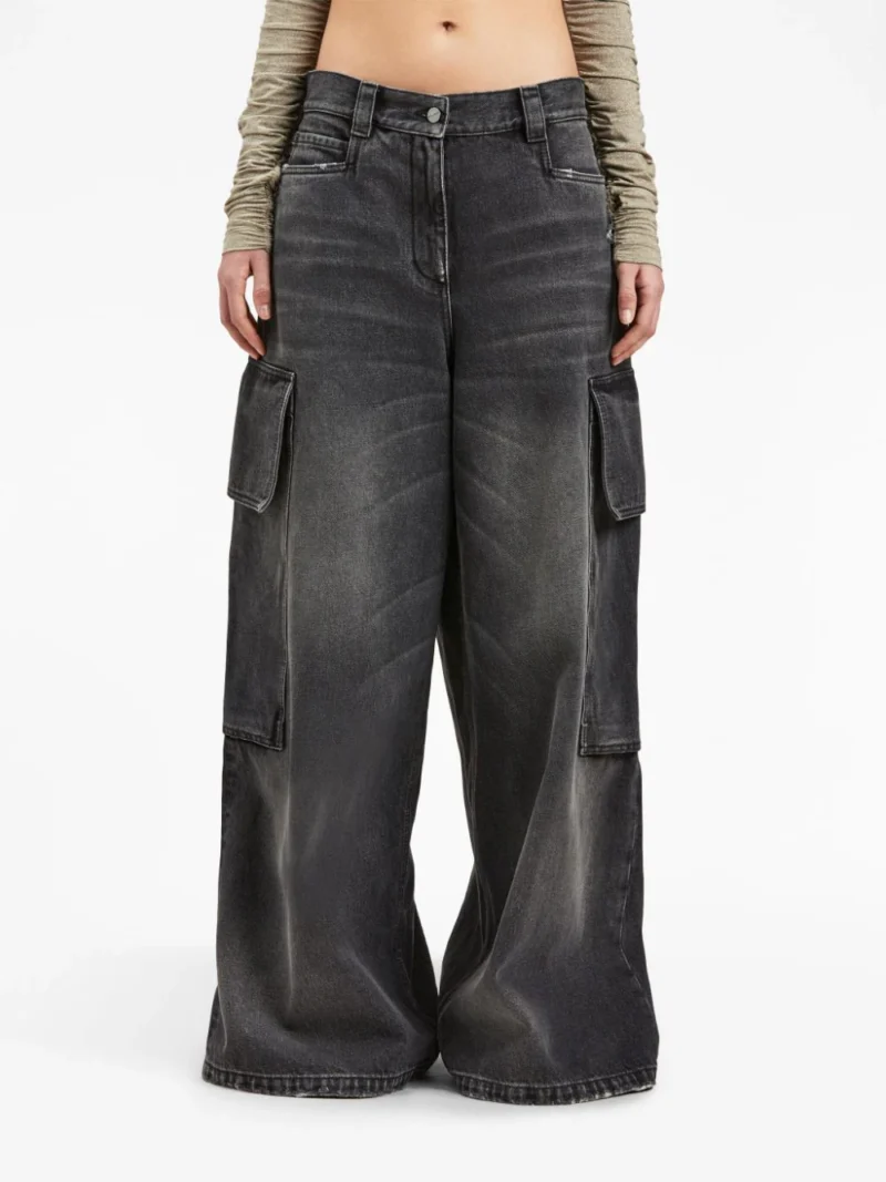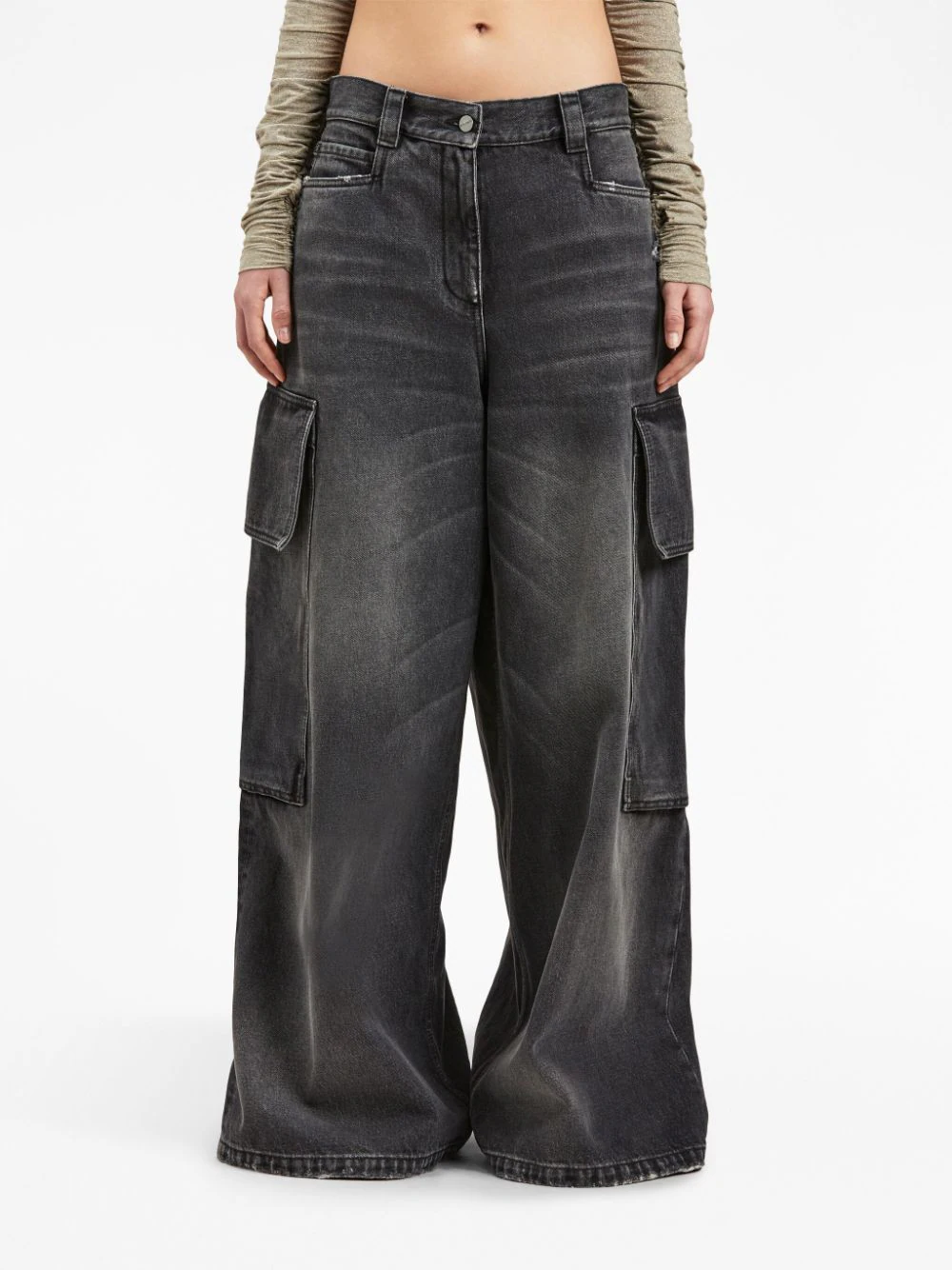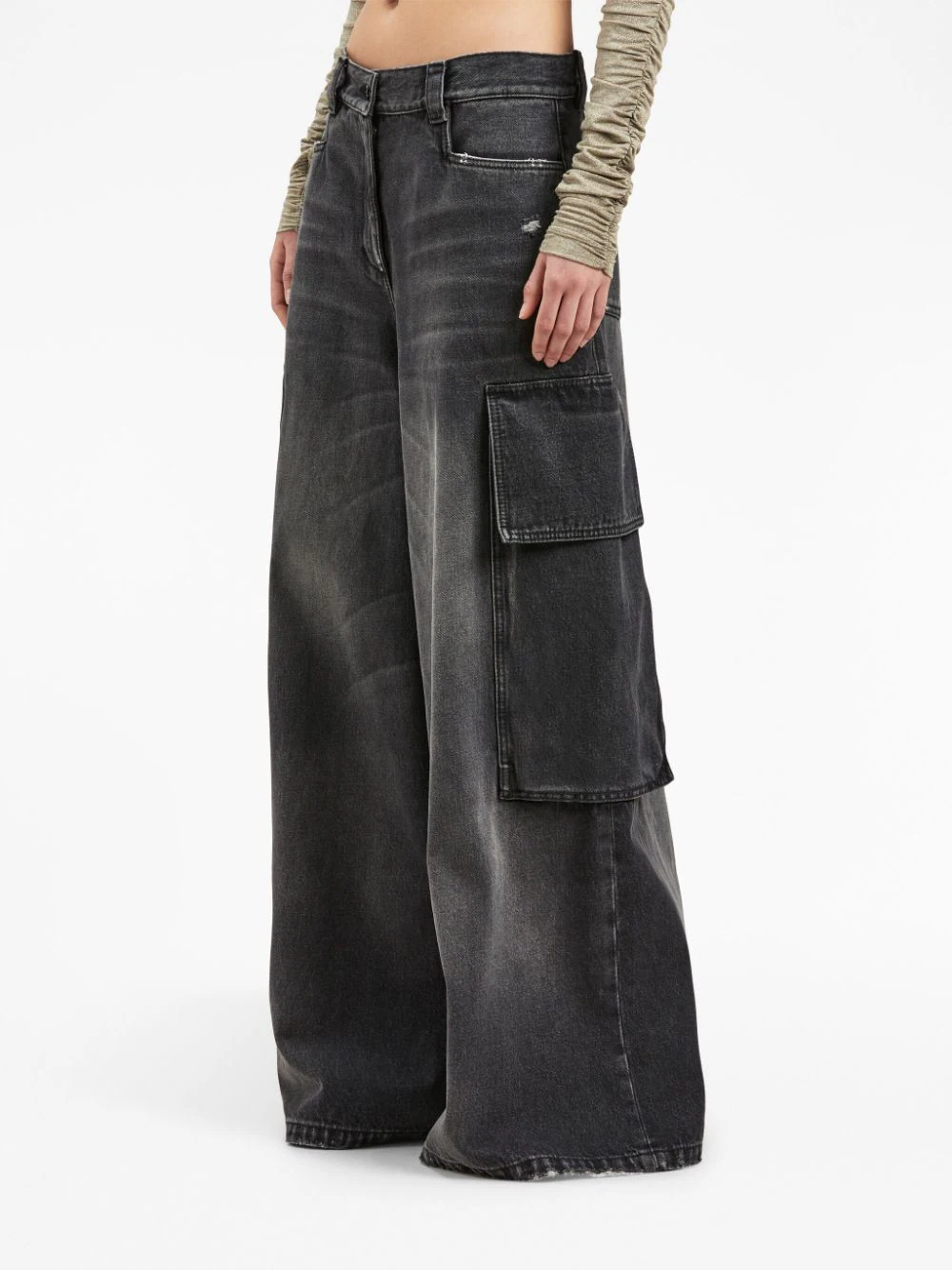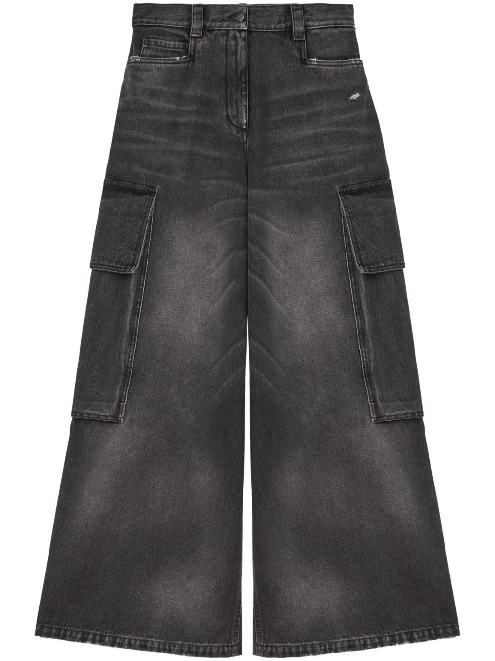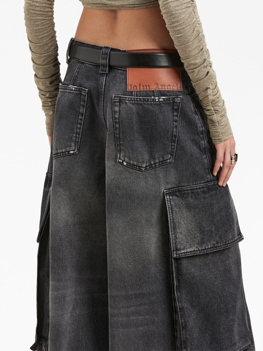 Pantaloni negri din bumbac denim, cu talie joasa, croiala wide leg, inchidere cu nasture si fermoar, eticheta Palm Angels din piele cusuta la spate, buzunare tip cargo si aspect decolorat. Potriviti pentru sezonul toamna/iarna. 100% bumbac; 100% piele; 100% bumbac.
